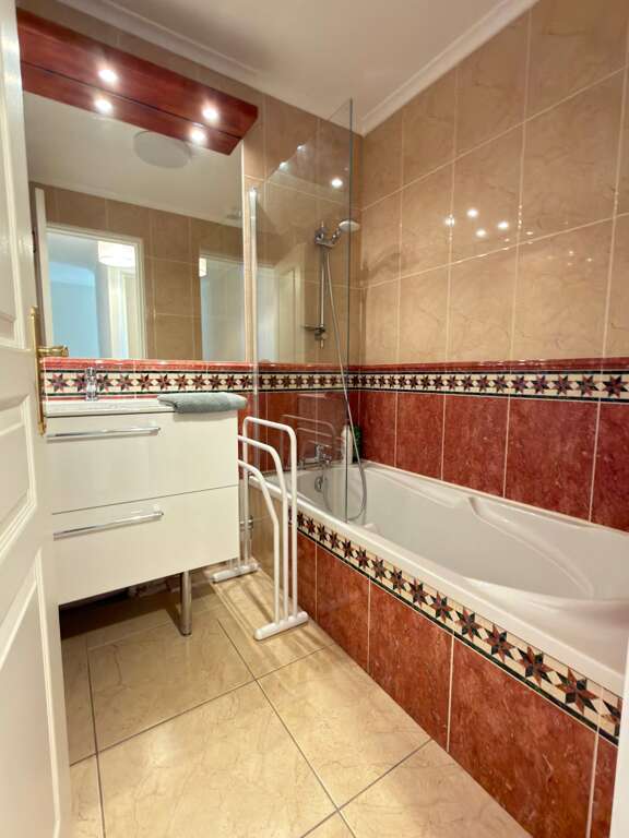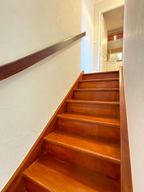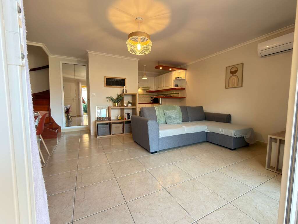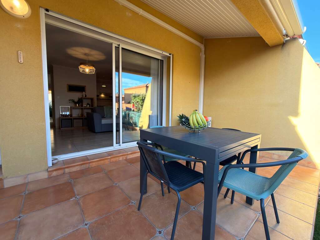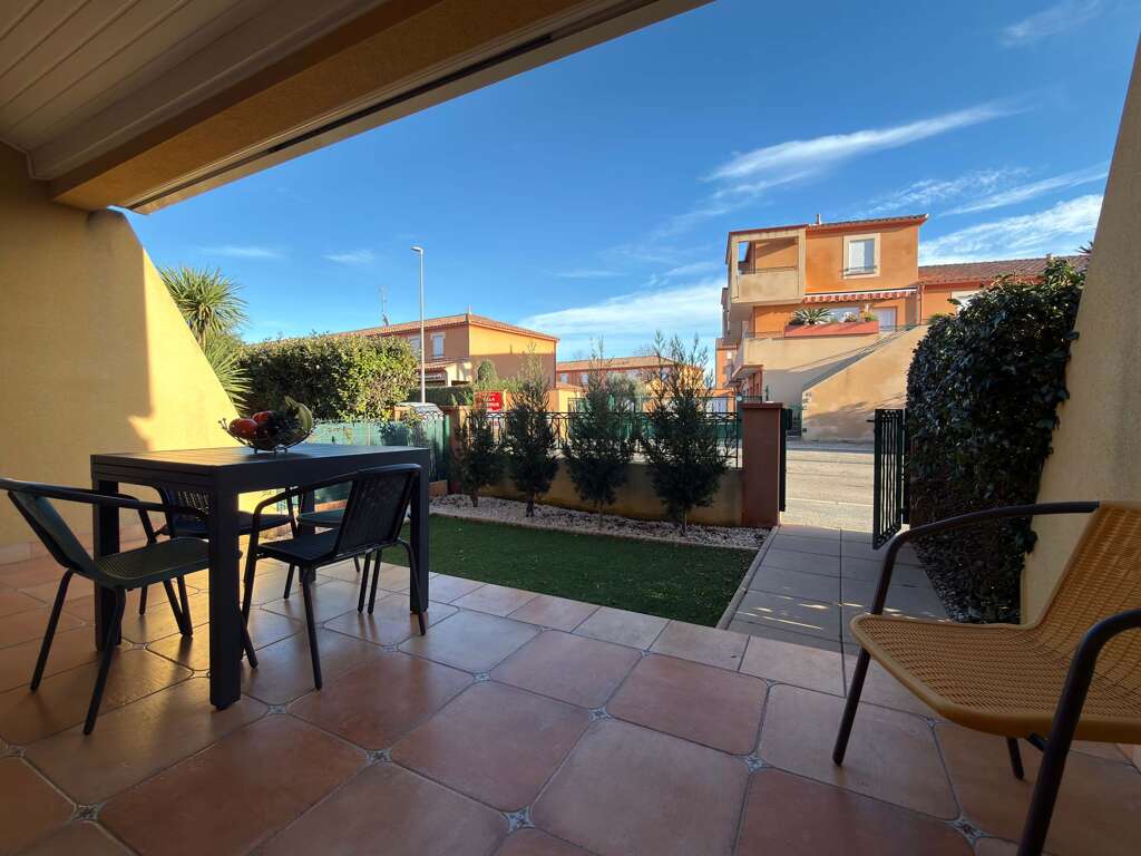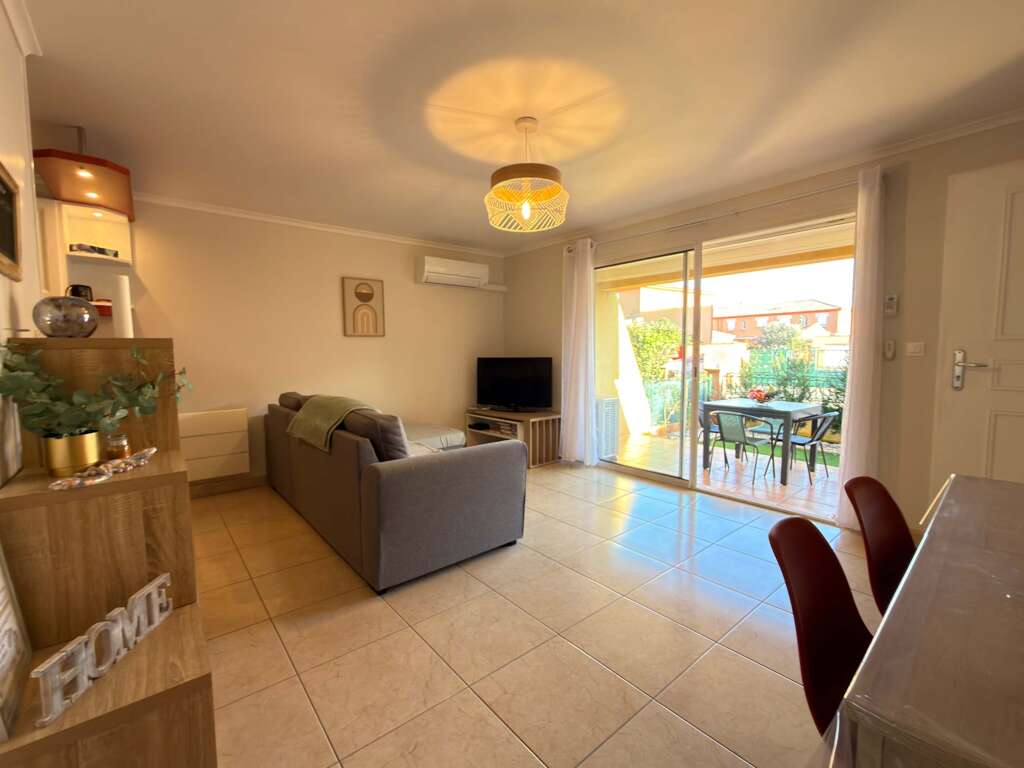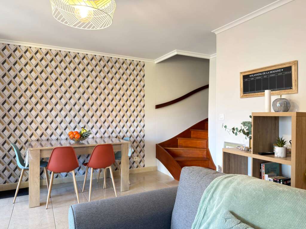 On the ground floor, a large sliding glass door opens onto the garden, with a covered terrace and a convertible table accommodating up to 6 people. The residence also offers a shared swimming pool and a secure parking space.