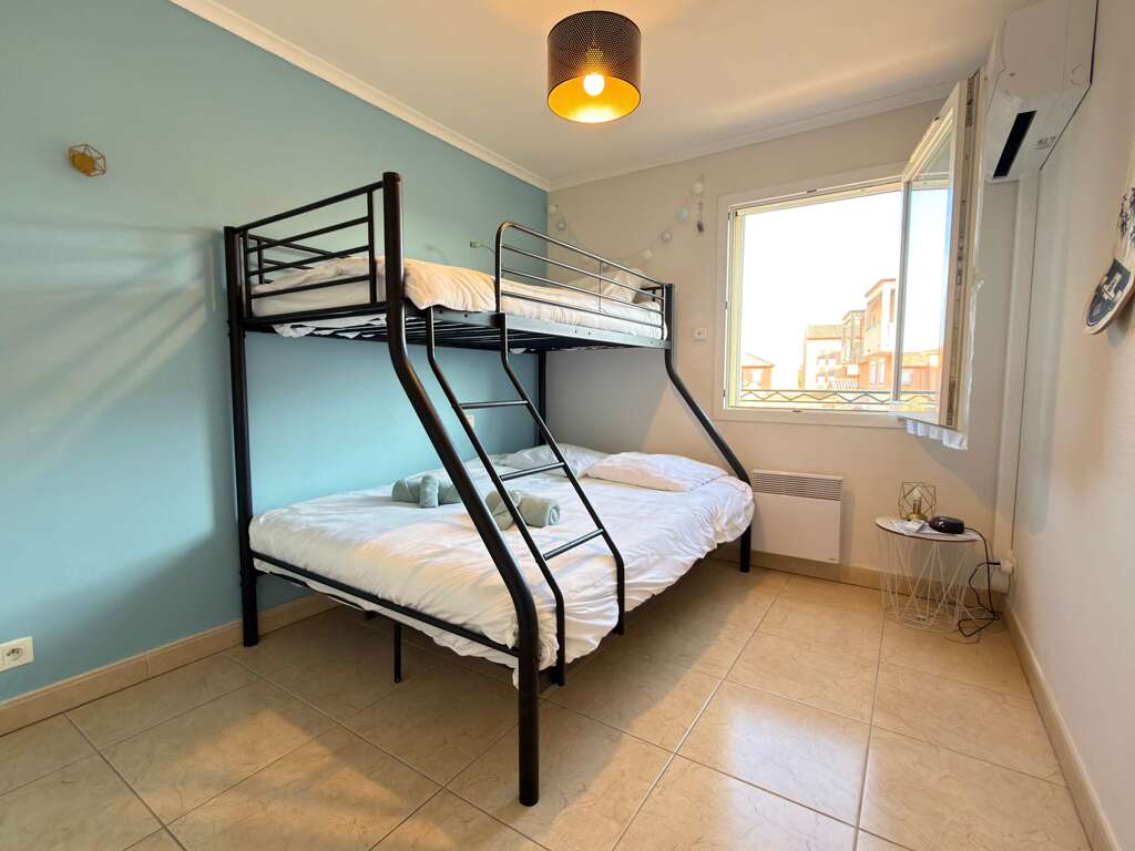 Bedroom 2: double bed (140 cm) and a 90 cm bunk bed, also with ample storage space.