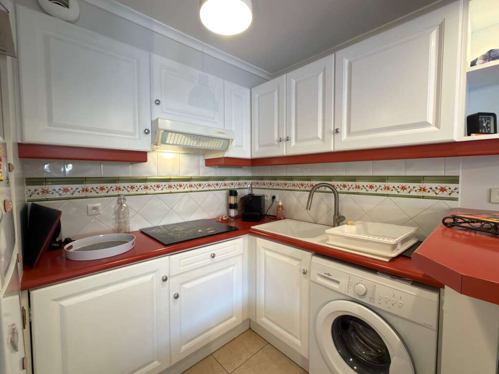 The bright living room features a sofa, television, dining table, and a fully equipped open kitchen, including a Nespresso coffee machine and a new electric plancha.