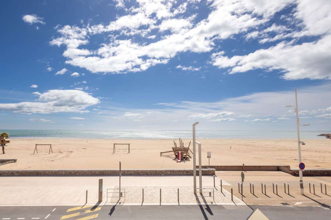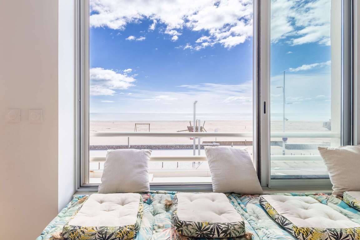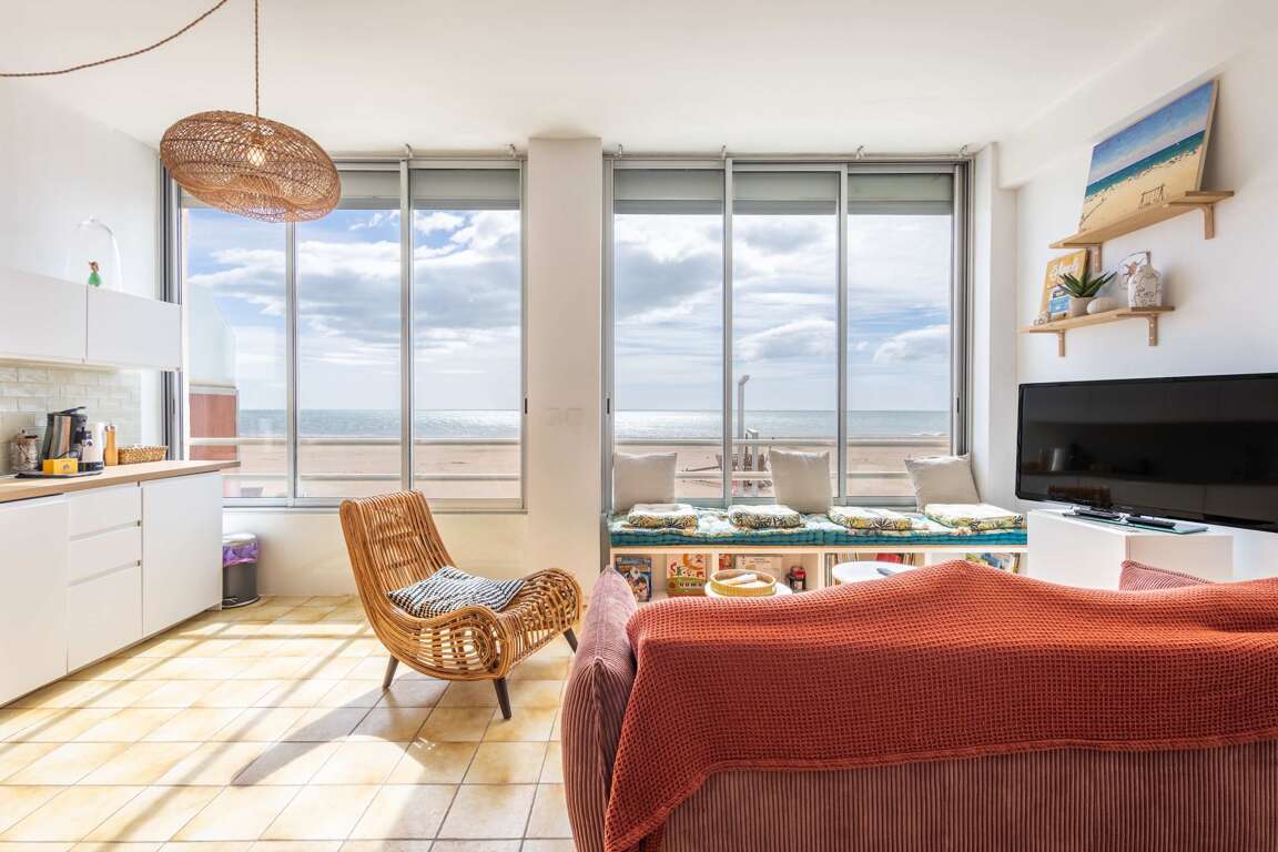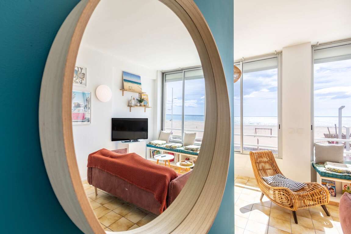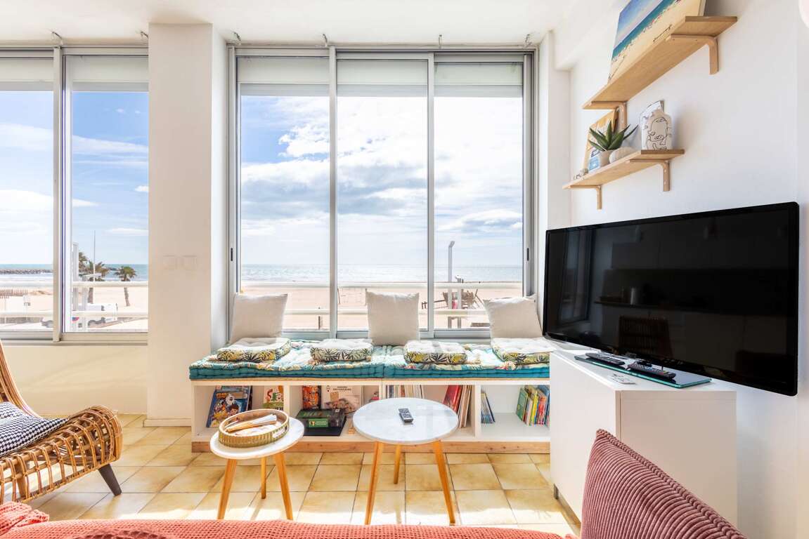 Seafront apartment rental in Valras-Plage with direct sea view, renovated interior, and walkable access to beach, shops, and restaurants for families.