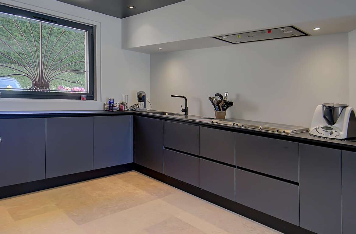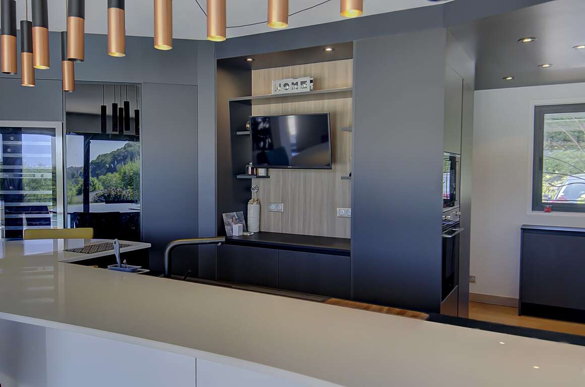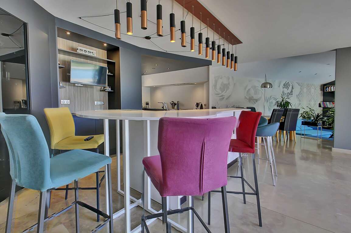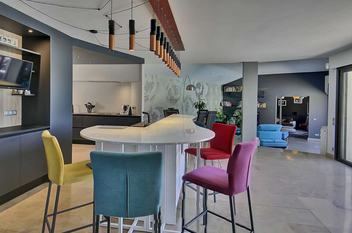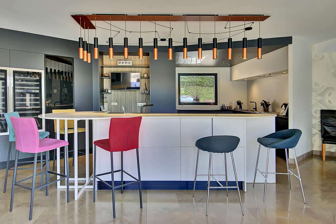 • Le point de ralliement : Un grand bar central fait sur mesure, idéal pour partager l'apéritif ou vos repas.