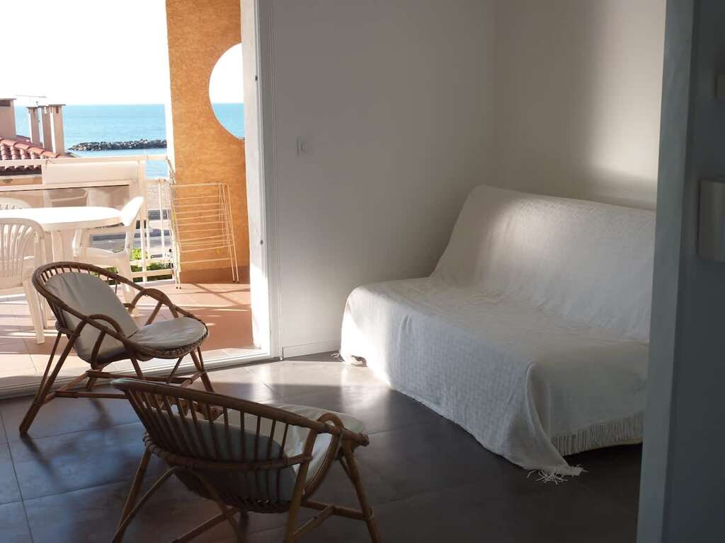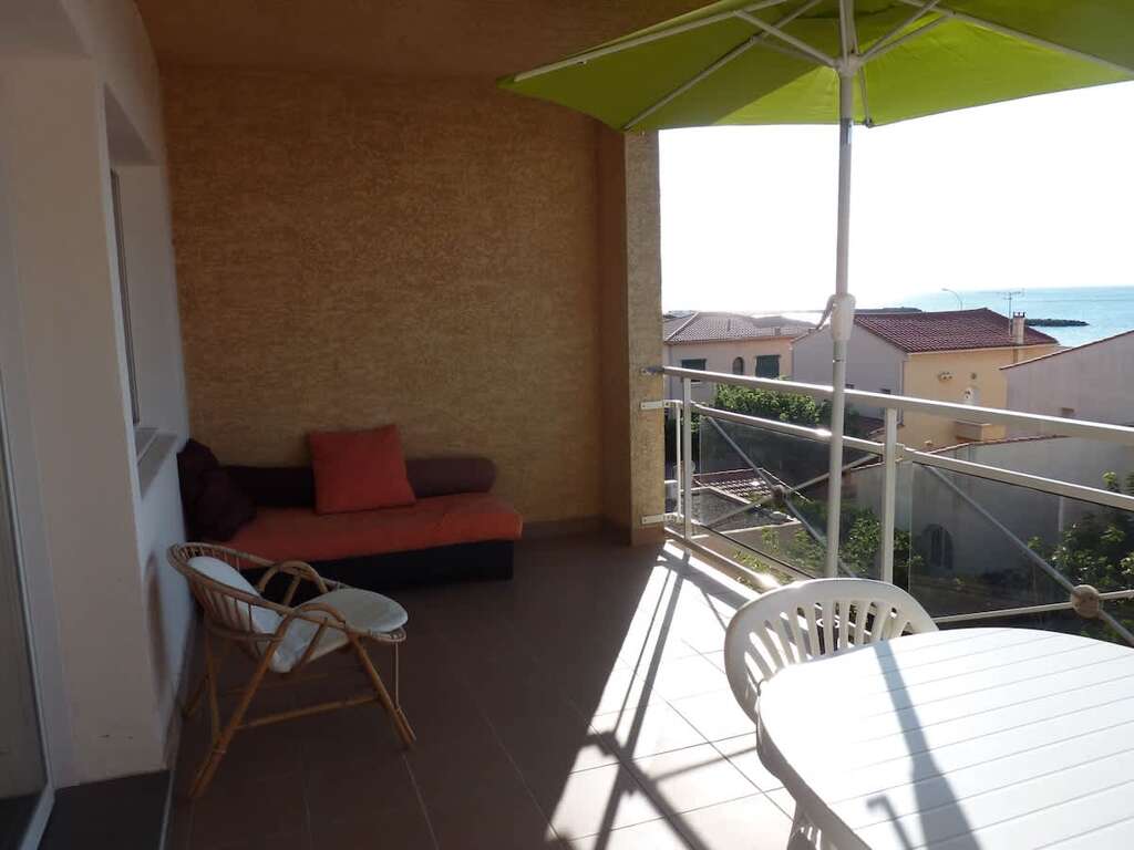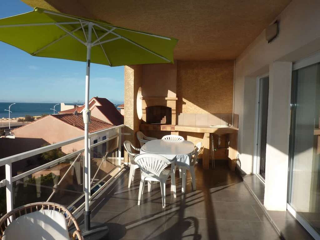 Apartment vacation rental in Valras-Plage with 2 bedrooms, a south-facing 18 m² terrace with sea view, and a beach 50 m away plus secure parking.