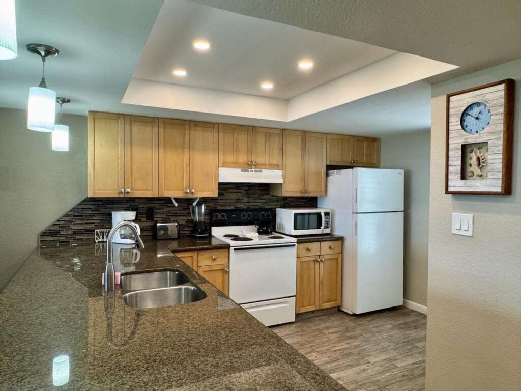 Kitchen: Fully stocked with standard appliances, utensils, and a standard coffee maker