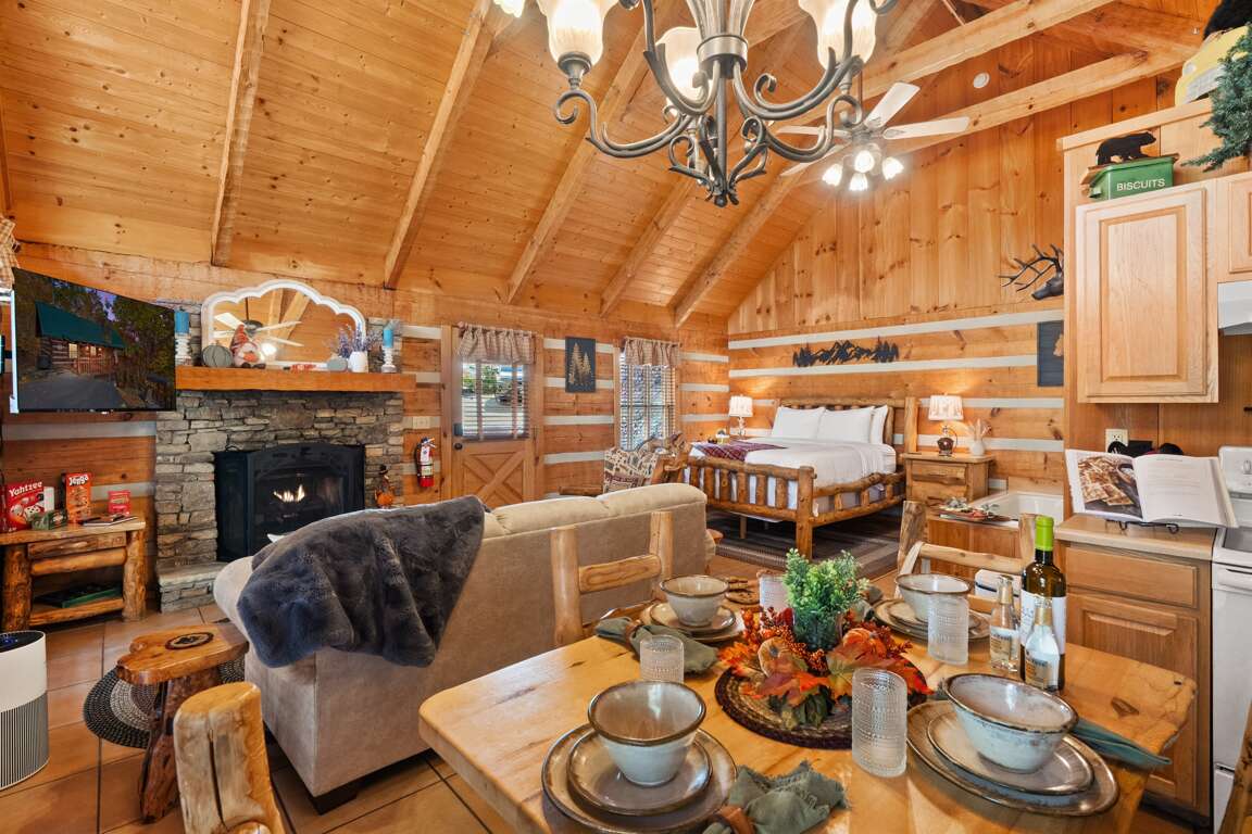 Welcome to Nestled Oaks, where Appalachian charm meets easy modern comfort. Step into warm timber interiors, soft lamplight, and the gentle glow of a gas fireplace—a perfect scene for slow mornings with coffee or quiet evenings after exploring Dollywood or hiking in Great Smoky Mountains National Park ️. The open studio layout keeps everything effortlessly connected: a plush log bed, cozy living area, dining area, and a new, larger smart TV for streaming your favorites.