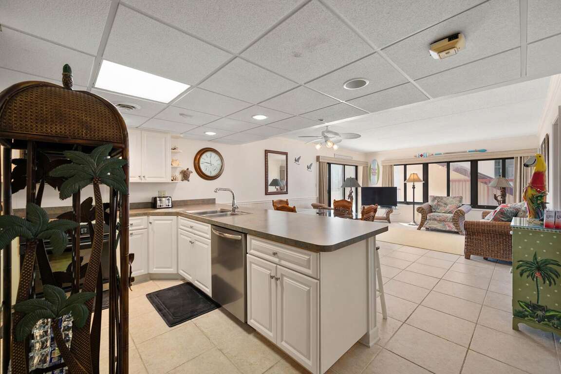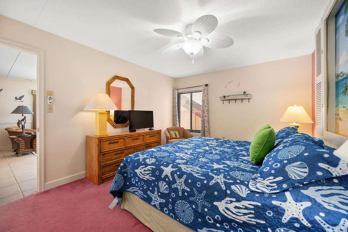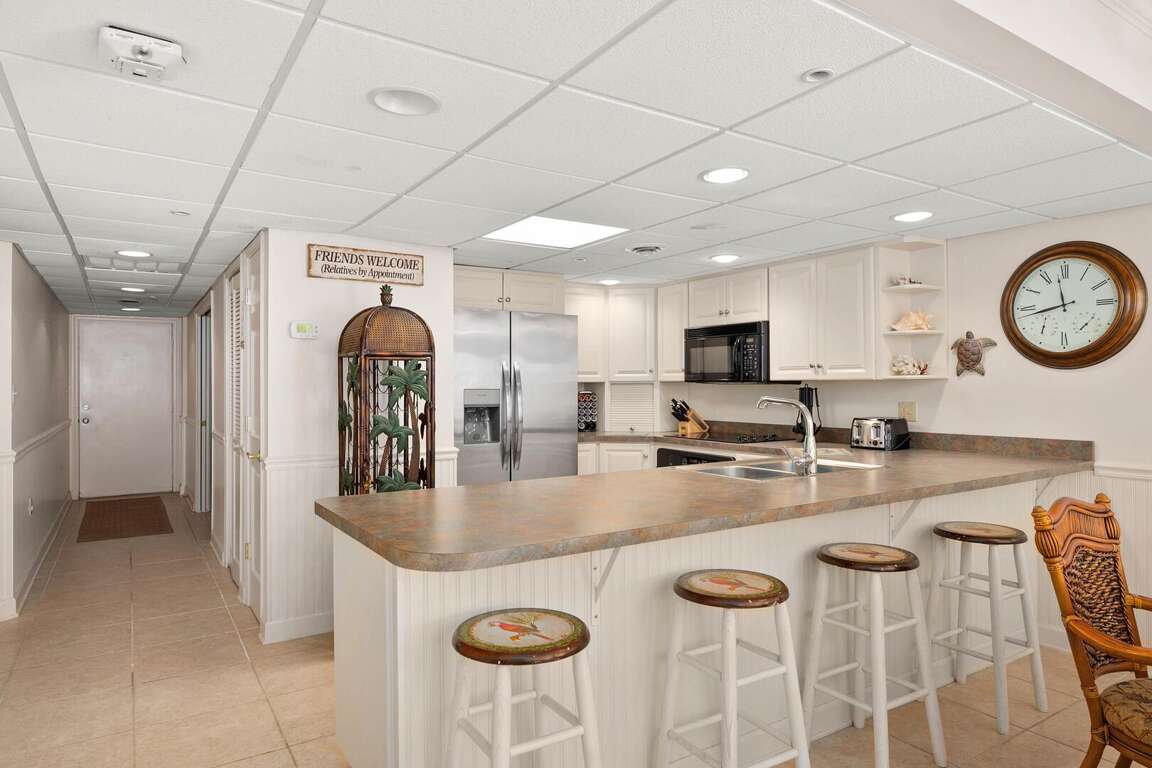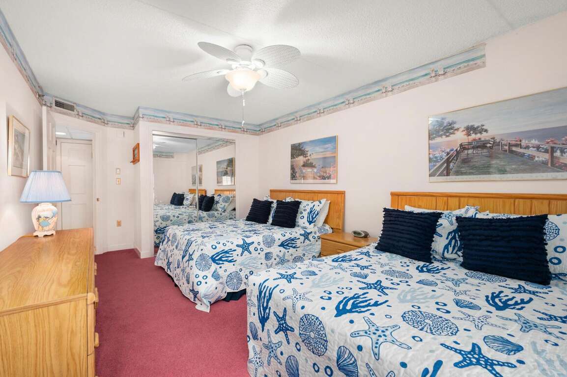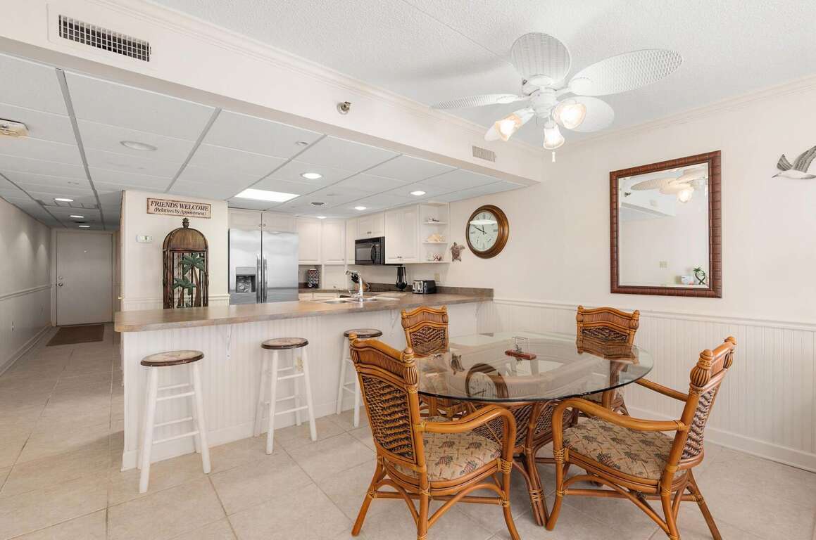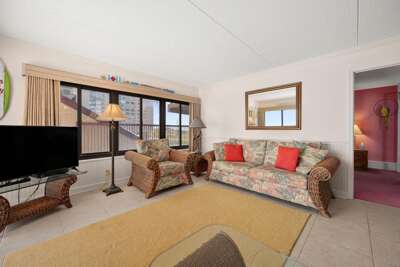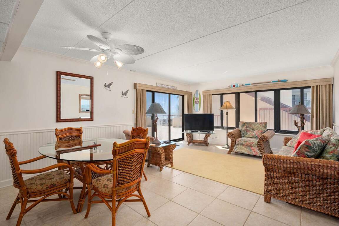This great 2-bedroom/den/2-bath condo offers easy access on the first floor and accommodates up to 9 people. Located in a fantastic oceanfront building, the condo features a limited view but is fully equipped with all the essentials. You'll have easy access to the pools, sundeck, and beach. The living room slider opens up to the sundeck area, which leads directly to the pool and beach. The den provides extra space, almost like a third bedroom, though it does not have closet space. The condo comes with a full kitchen, washer/dryer, microwave, 3 smart TVs with internet access, and Xfinity cable in the living room and bedroom. Other amenities include central A/C and parking for 2 cars. Please note, the building charges a non-refundable registration fee upon arrival to the Rainbow. This condo is non-smoking, and pets are prohibited.