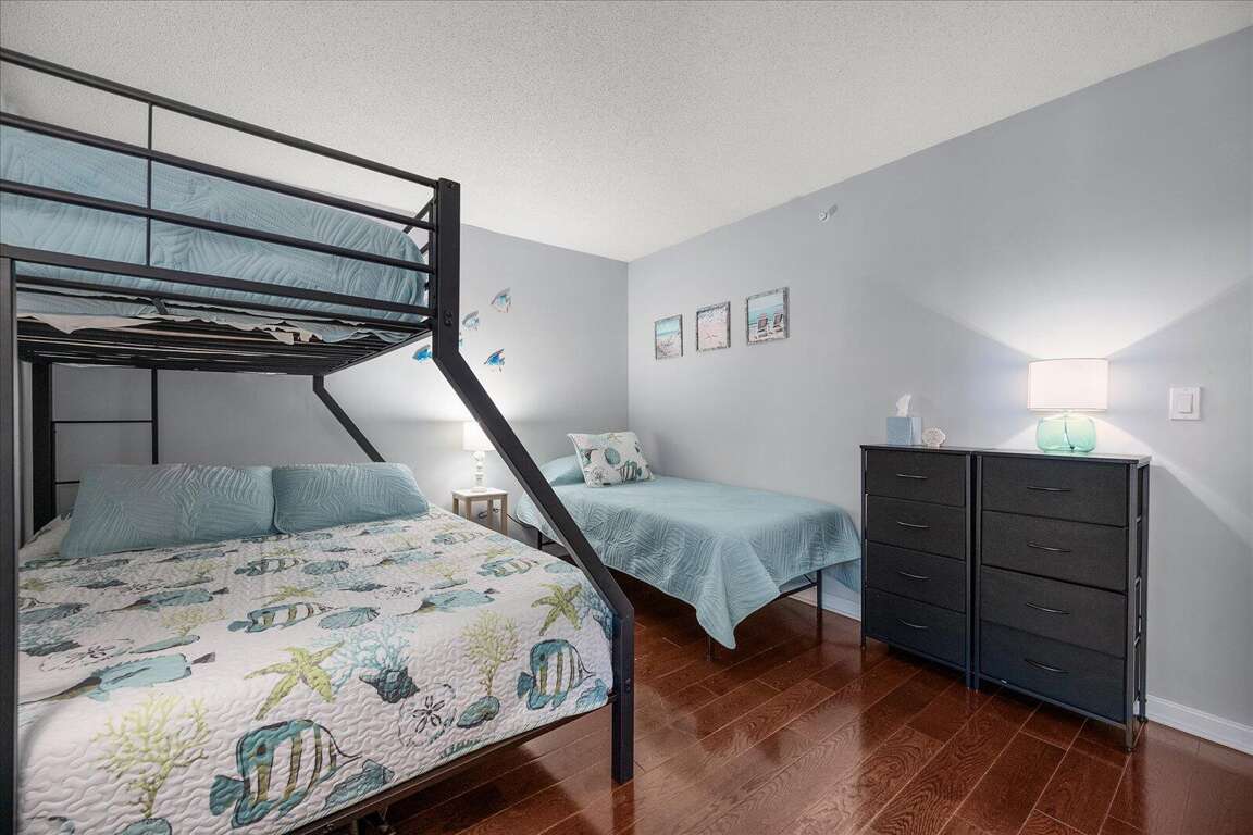 Welcome to Sandy Lane Estates 202B! This two-bedroom, two-bath unit offers everything you need for your vacation, with accommodations for up to 6 people. The condo features a fully equipped kitchen, washer/dryer, central A/C, free Wi-Fi, and streaming services on each of the 2 flat-screen TVs. Located off 32nd Street bayside, the complex offers an outdoor pool and tennis courts for your enjoyment. The spacious living room opens up to an expansive balcony overlooking the pool, perfect for relaxing after a day in the sun. Adjacent to the living room is a dining area, ideal for family meals, and a fully equipped kitchen with a breakfast bar. The master bedroom includes a king bed, private bathroom, and balcony access. The second bedroom features a queen and a bunk bed, with the second bathroom located in the hallway. This property comfortably sleeps up to 6, so bring the whole family! It includes two parking spaces, with additional street parking available on a first-come, first-serve basis.