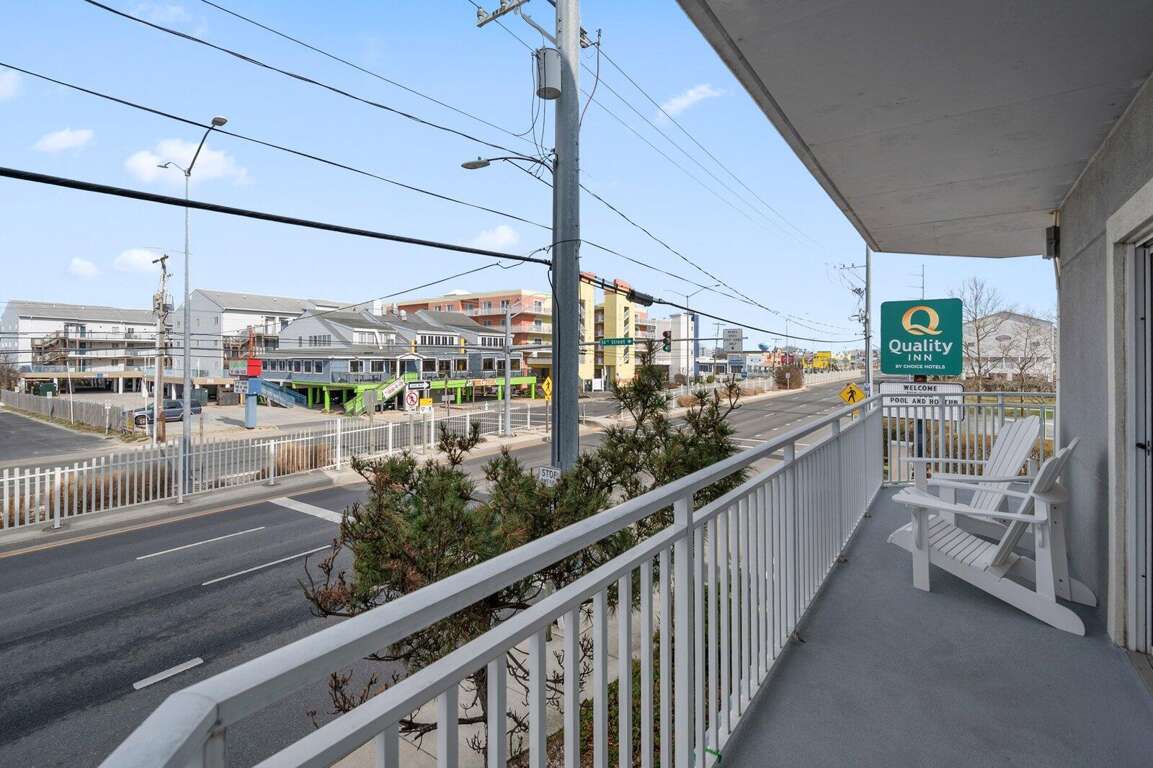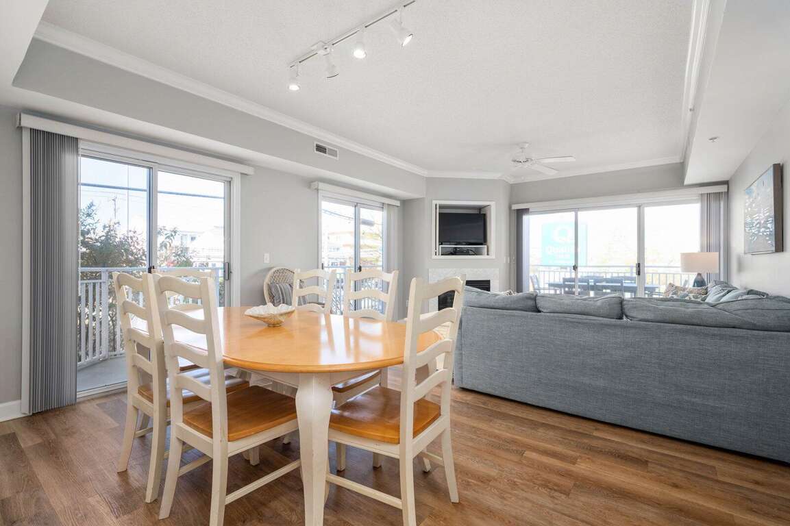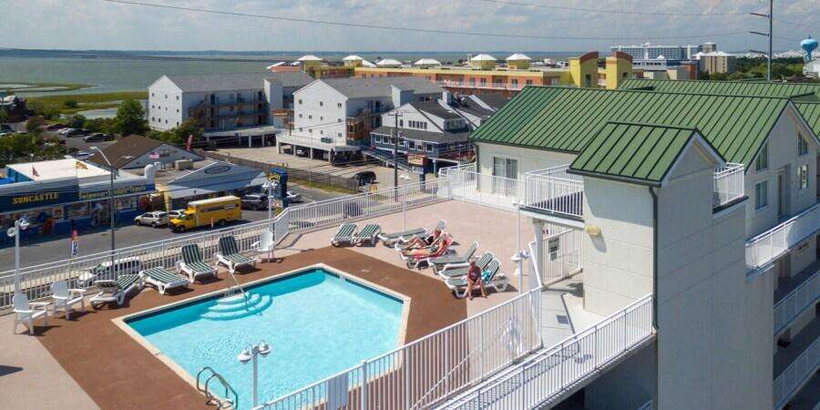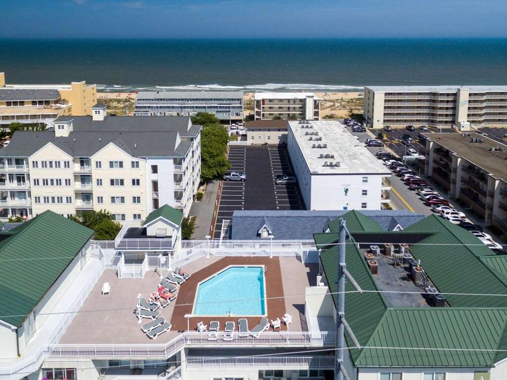 Ocean City condo vacation rental on the ocean block with 3 bedrooms, 2 baths, rooftop pool, balconies, full kitchen, and washer/dryer; sleeps 10.