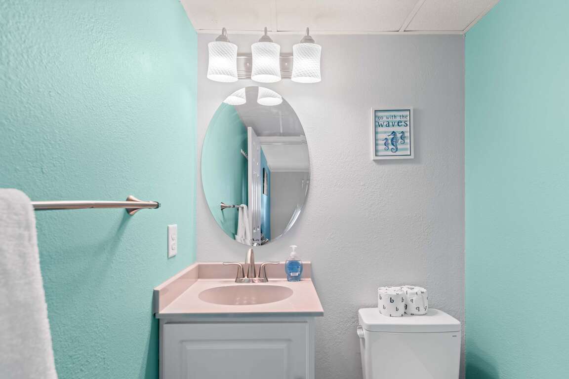 Inside, the open-concept living space is filled with natural light, coastal décor, and comfortable seating. Two Smart TVs with streaming (use your own logins), high-speed Wi-Fi, and family-friendly extras like books, toys, and board games keep everyone entertained. The bedroom includes one queen and one full bed with a Smart TV, dresser, and room-darkening shades, while 1.5 bathrooms and in-unit laundry add convenience throughout your stay.