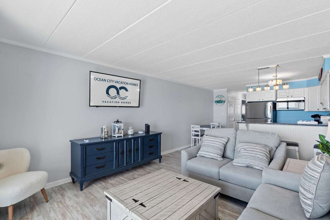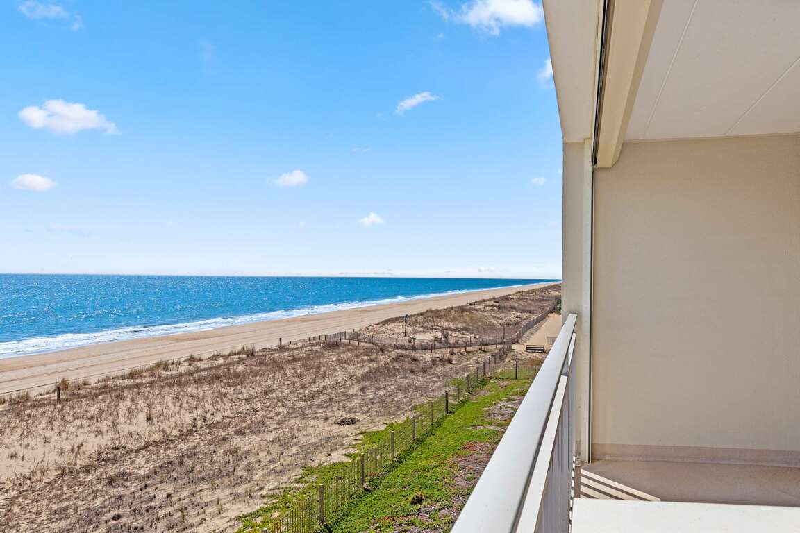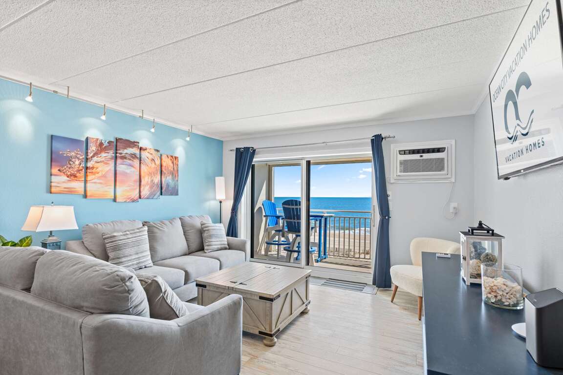 An oceanfront condo, Salty Sands 302, with a balcony, located in Ocean City, MD. Fully equipped with modern amenities like television, internet access, and washer/dryer.