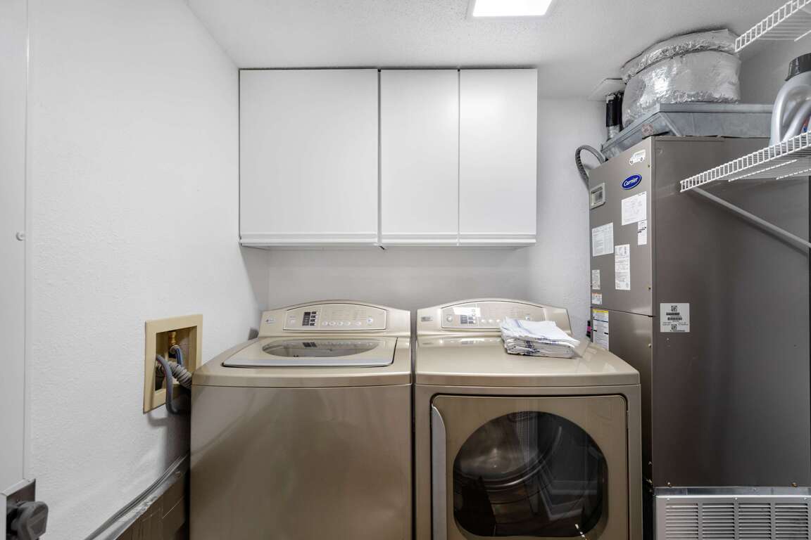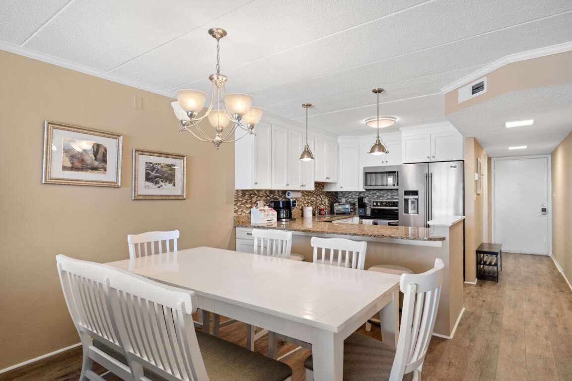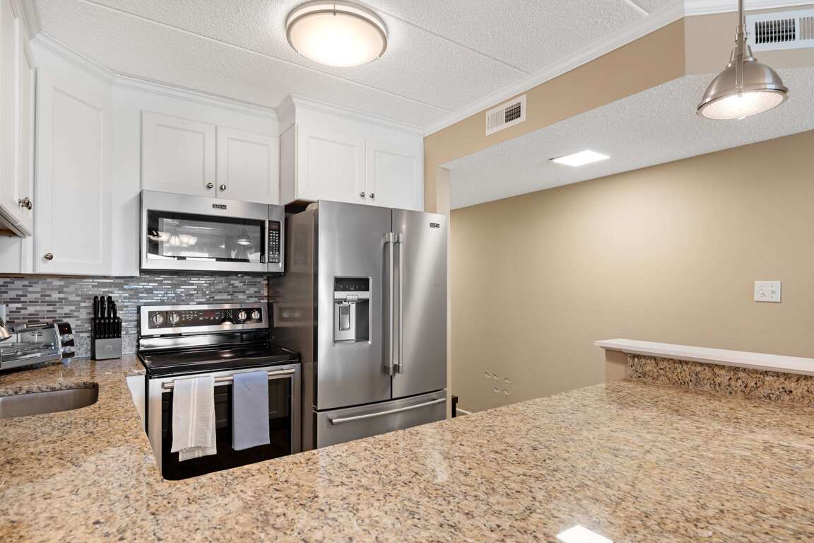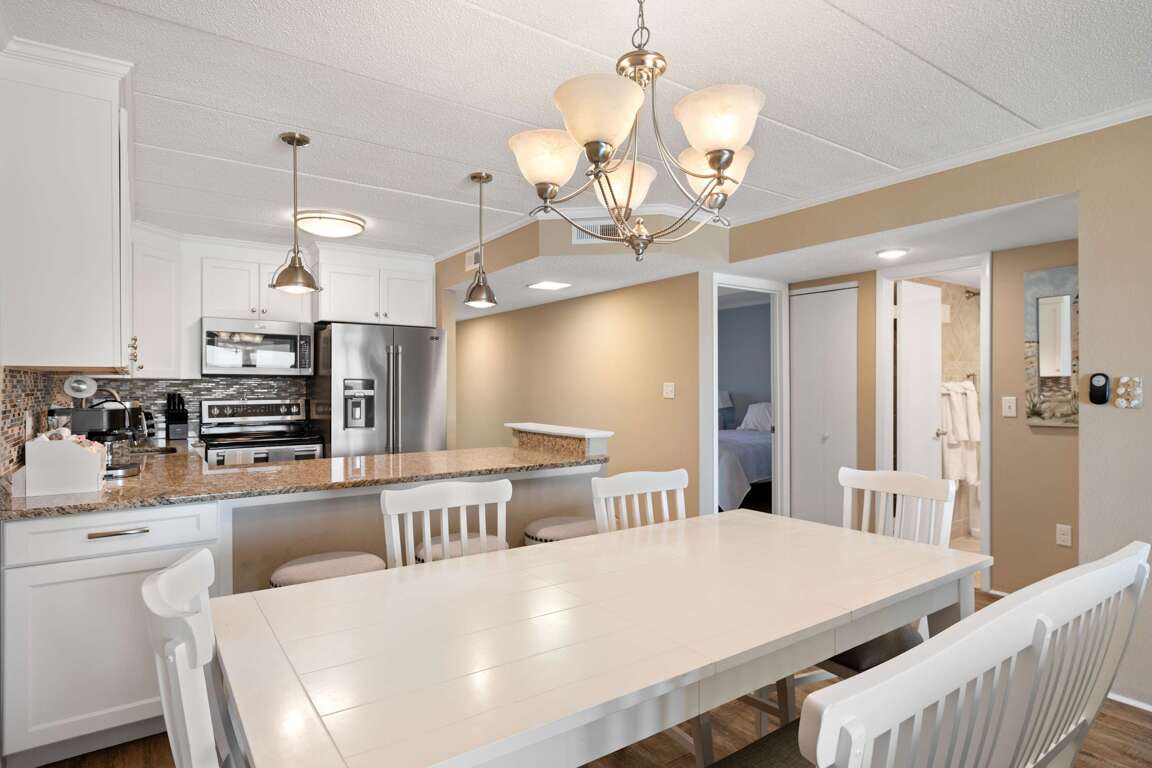 The open living area features plush seating, a Smart TV for streaming, and sliding glass doors to the balcony. Cook in the fully equipped kitchen with stainless steel appliances, Keurig and drip coffee makers, and a dining area for six plus counter seating for four. Each bedroom includes Smart TVs and coastal touches, while the in-unit washer and dryer keep your stay hassle-free.