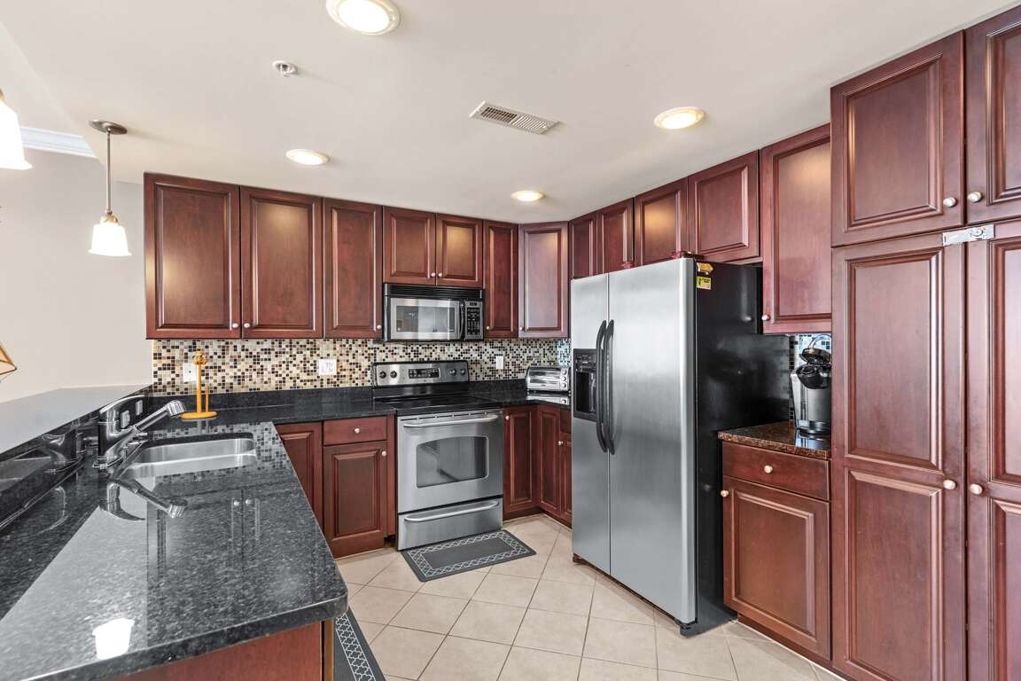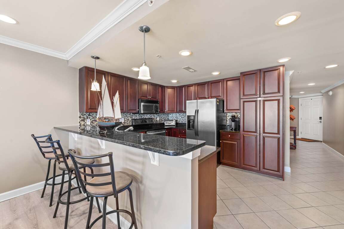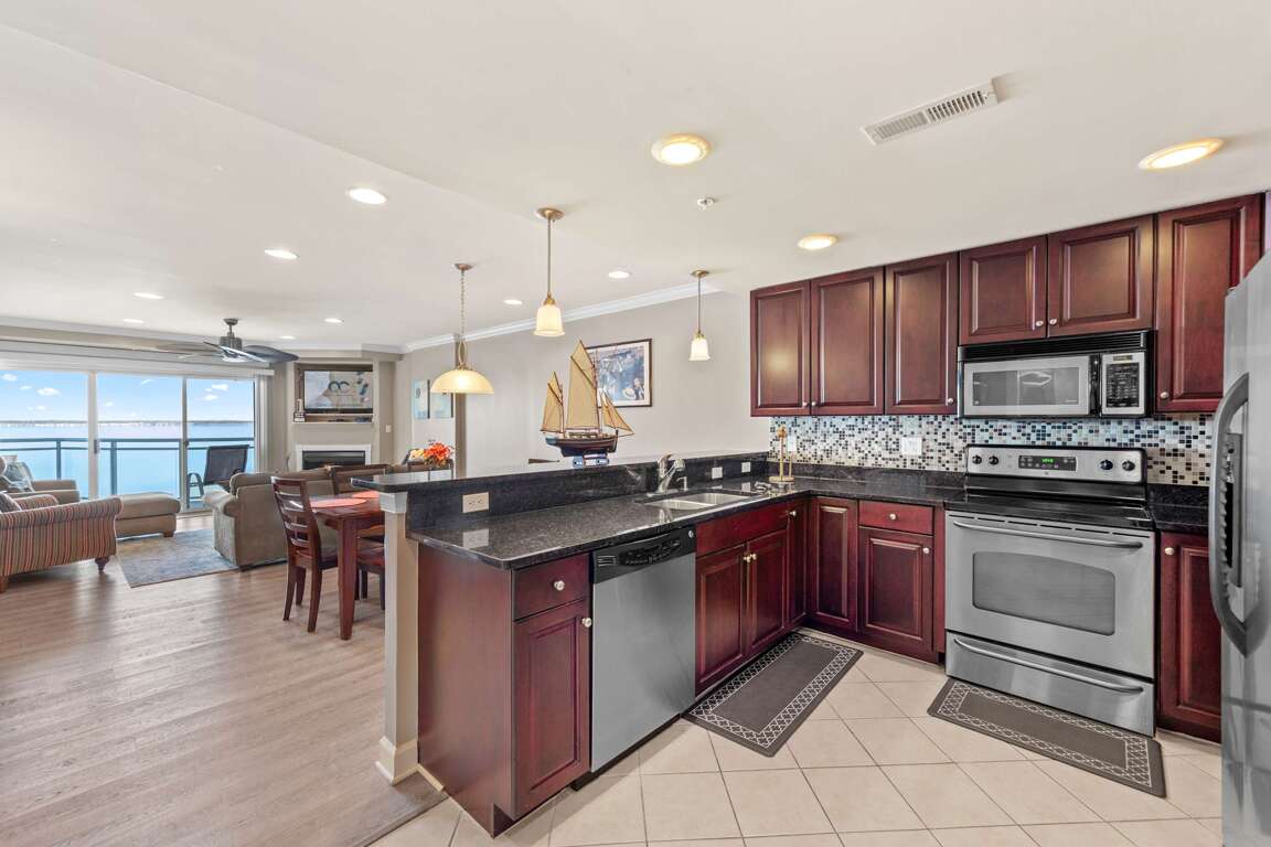 Step onto your private balcony to watch the sun set over the water, or relax inside the light-filled living area featuring multiple sofas, recliners, and a gas fireplace. Gather for movie nights on the streaming-capable flat-screen TVs, or prepare family meals in the open kitchen with polished granite counters, stainless-steel appliances, and a Keurig pod-style coffee maker conveniently located beside the refrigerator.