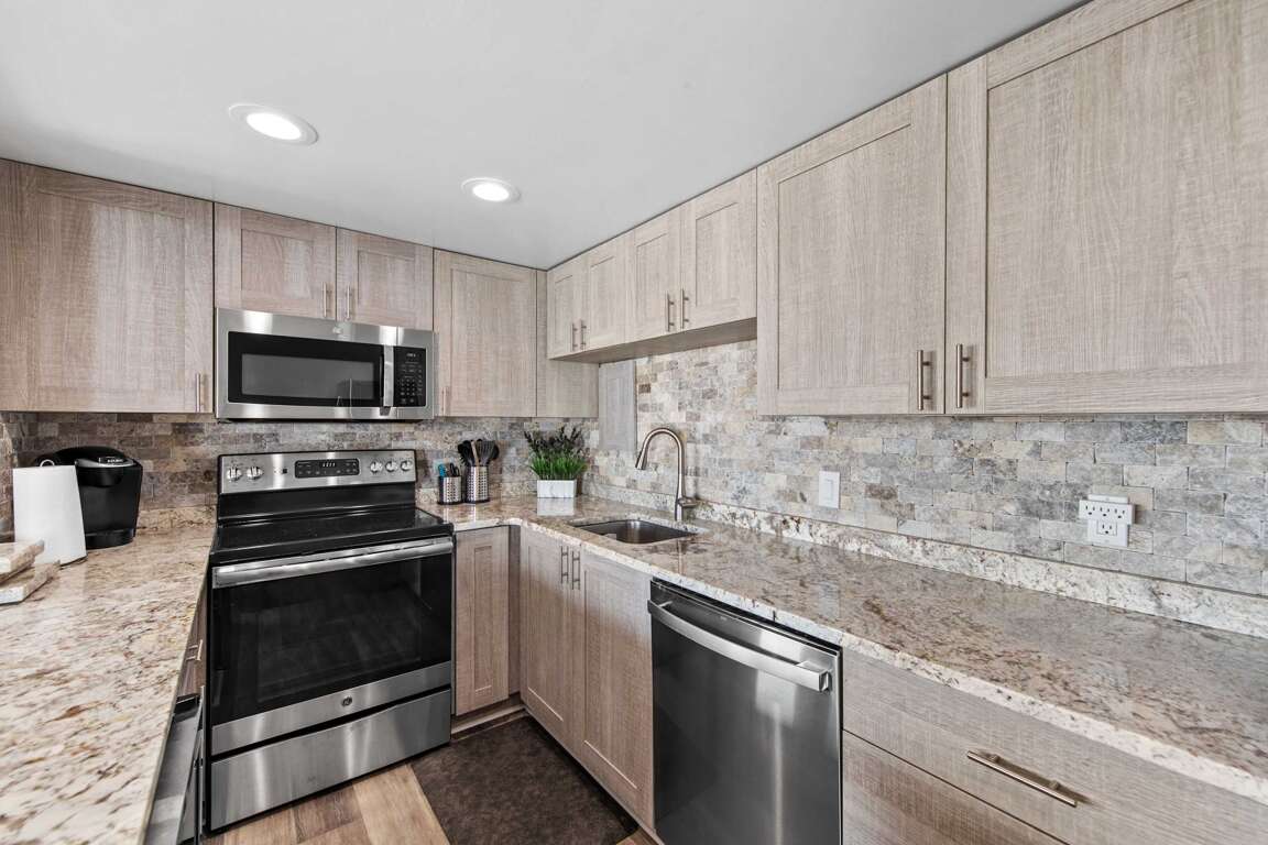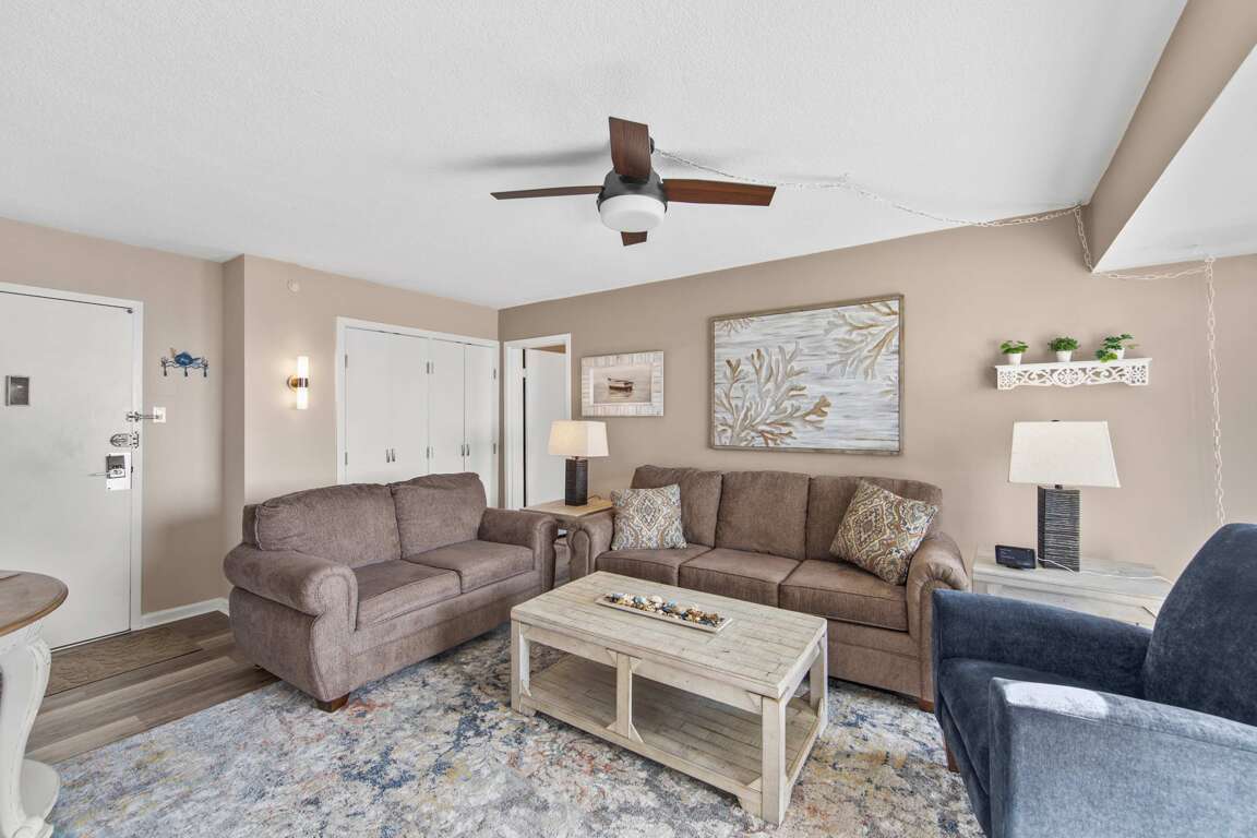 Inside, the open-concept living and dining area provides plenty of space for family gatherings and cozy movie nights. The fully equipped kitchen features sleek countertops, modern appliances, and a Keurig pod-style coffee maker to start your mornings right. After dinner, settle into the comfortable living space for a movie night or plan tomorrow’s beach adventure.