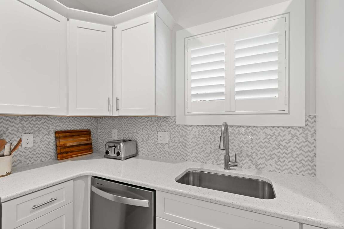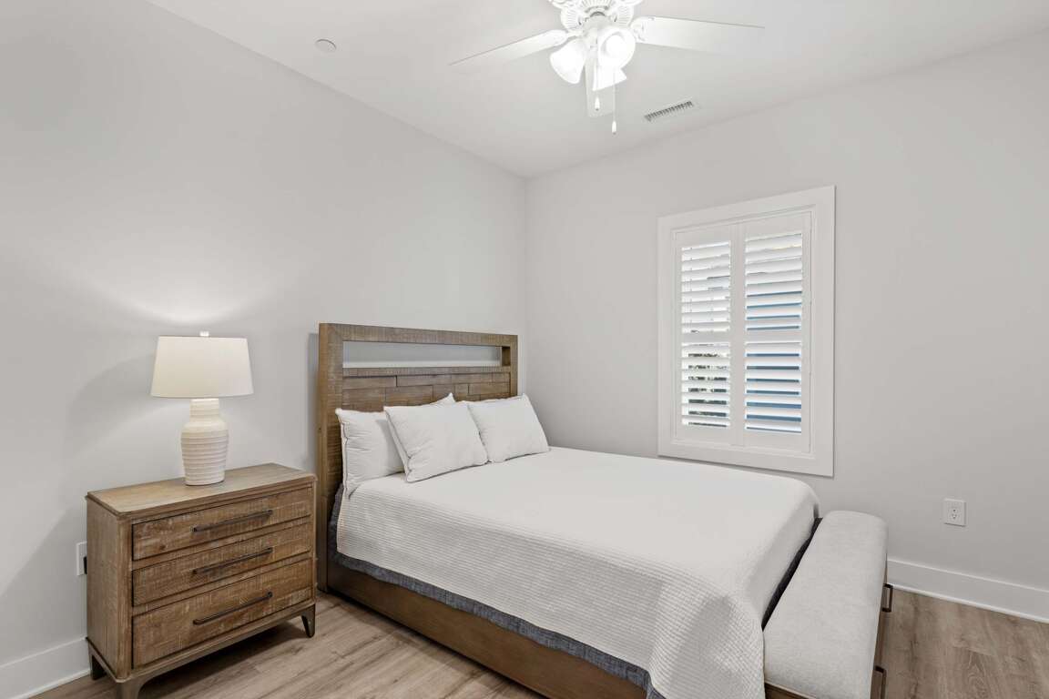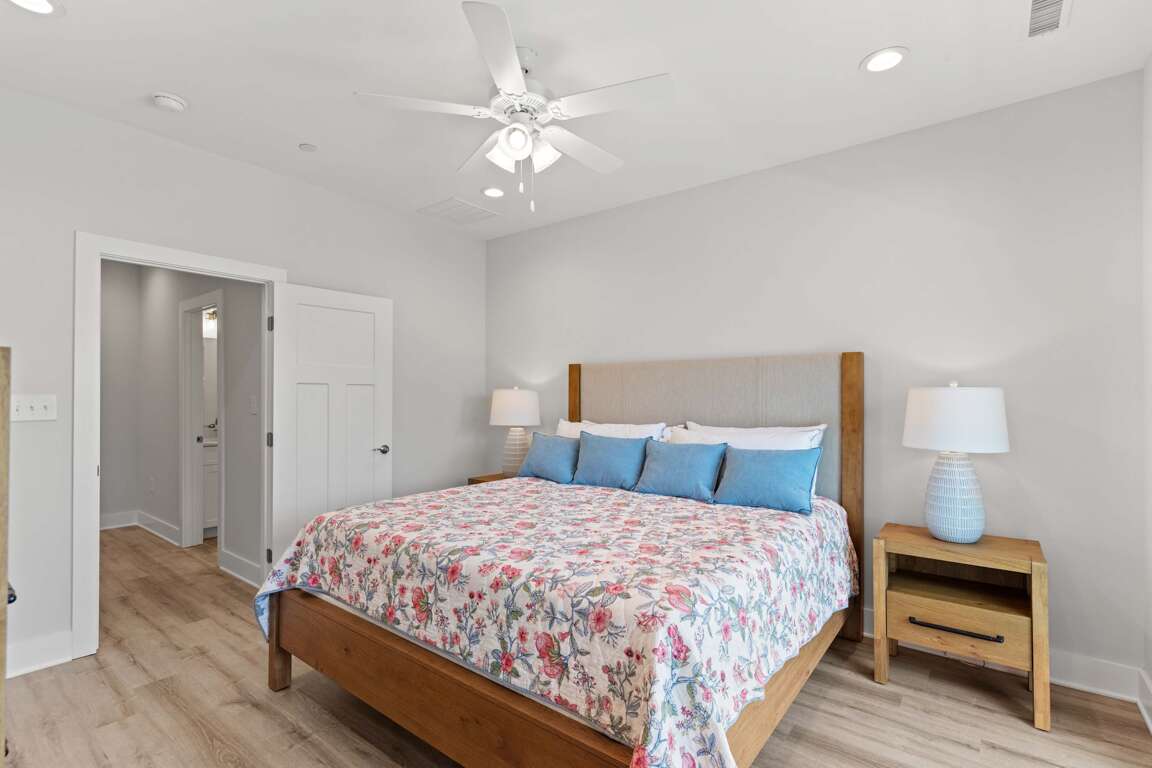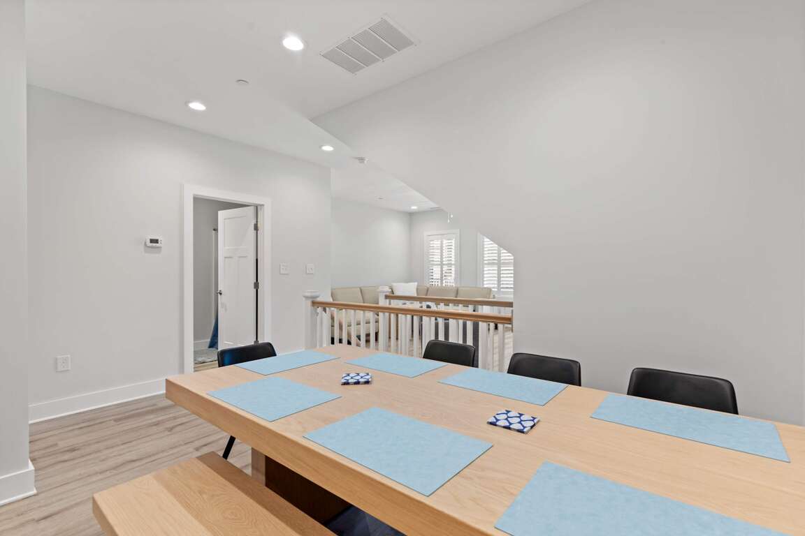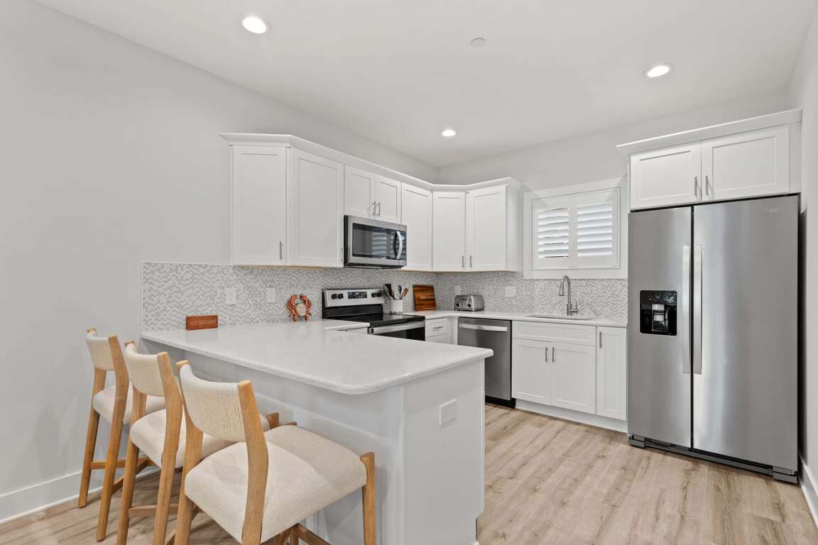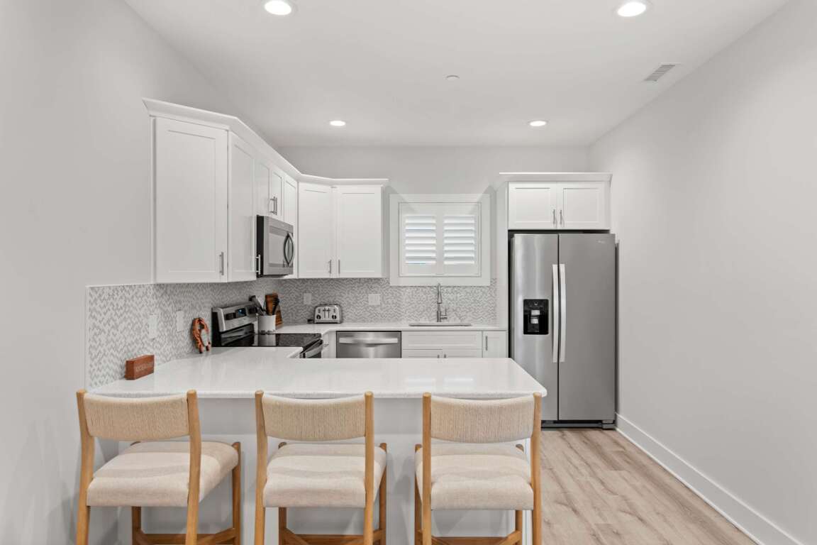The open-concept living area is filled with natural light and thoughtfully chosen furnishings, creating an inviting space to unwind after a day on the sand. The sleek kitchen is fully equipped with stainless steel appliances, a water-and-ice refrigerator, and a peninsula with three bar stools. Gather around the large dining table, which comfortably seats seven, for shared meals or game nights. For added convenience, a full-size washer and dryer is included.