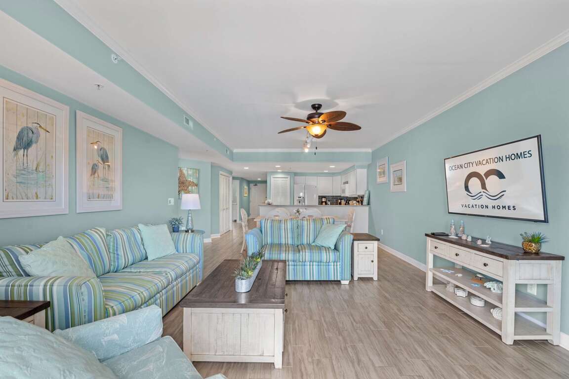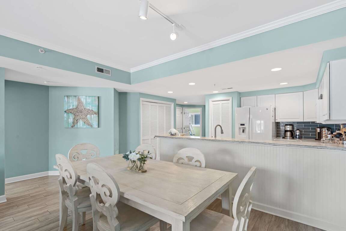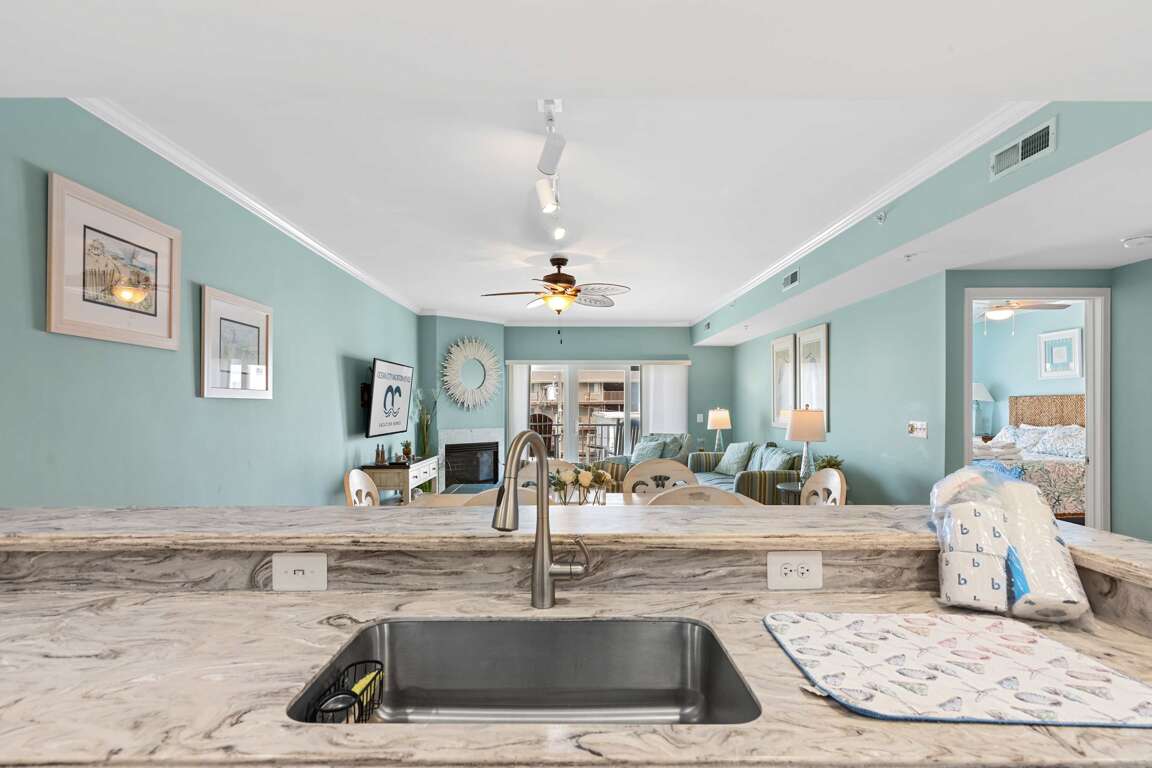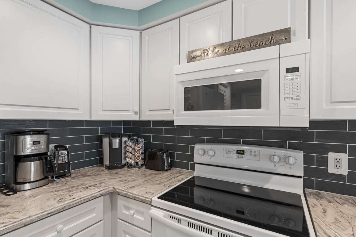 Step into the open-concept living space, where your group can gather for meals or unwind after a day on the sand. Slide open the glass doors to access the furnished balcony and enjoy refreshing ocean breezes with your morning coffee. The kitchen is fully stocked for home-cooked meals and includes a Keurig for your favorite K-cups.