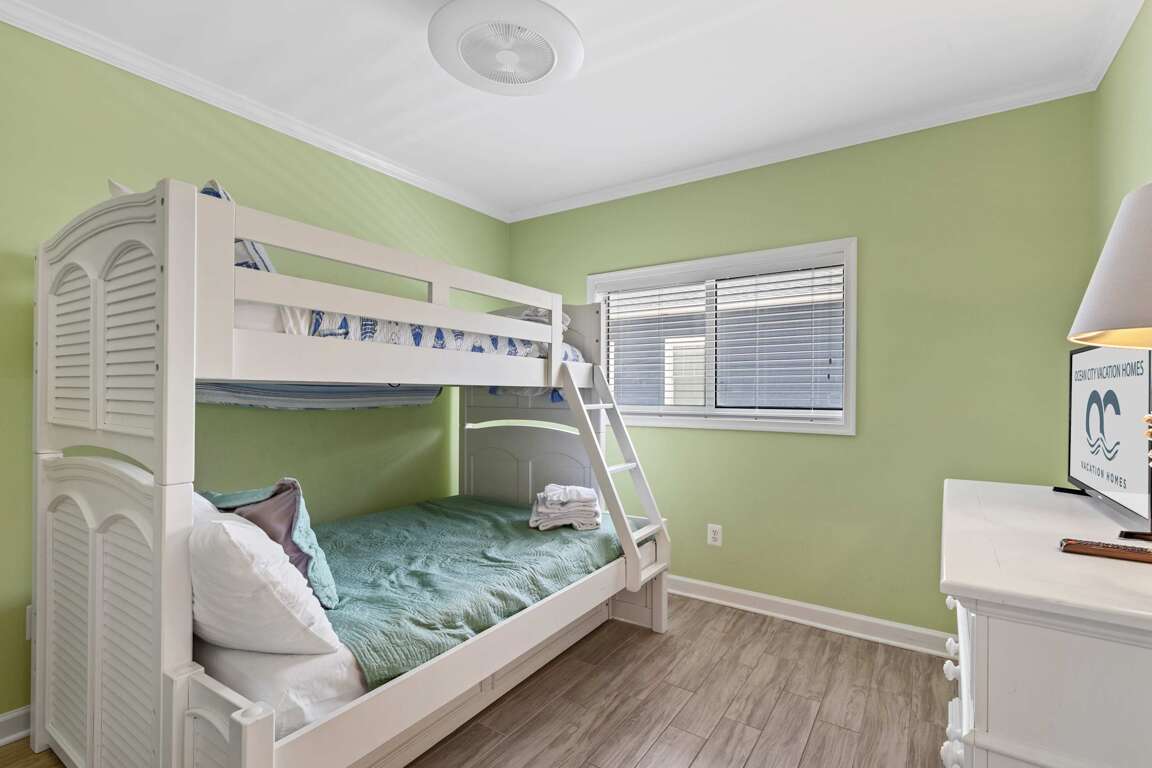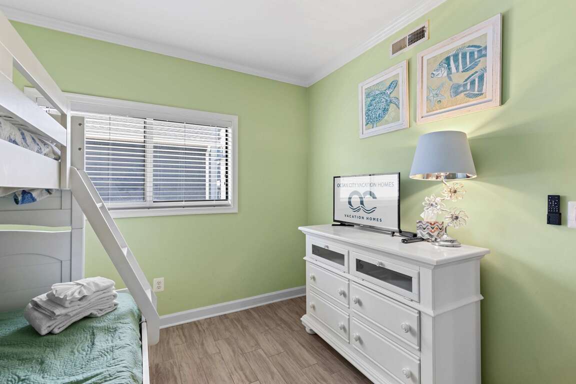 Bedroom 3: Pyramid bunk (twin over full) + twin trundle, TV
