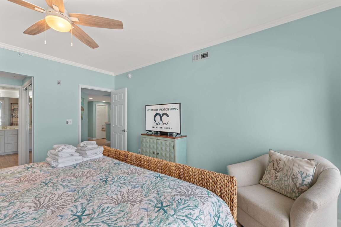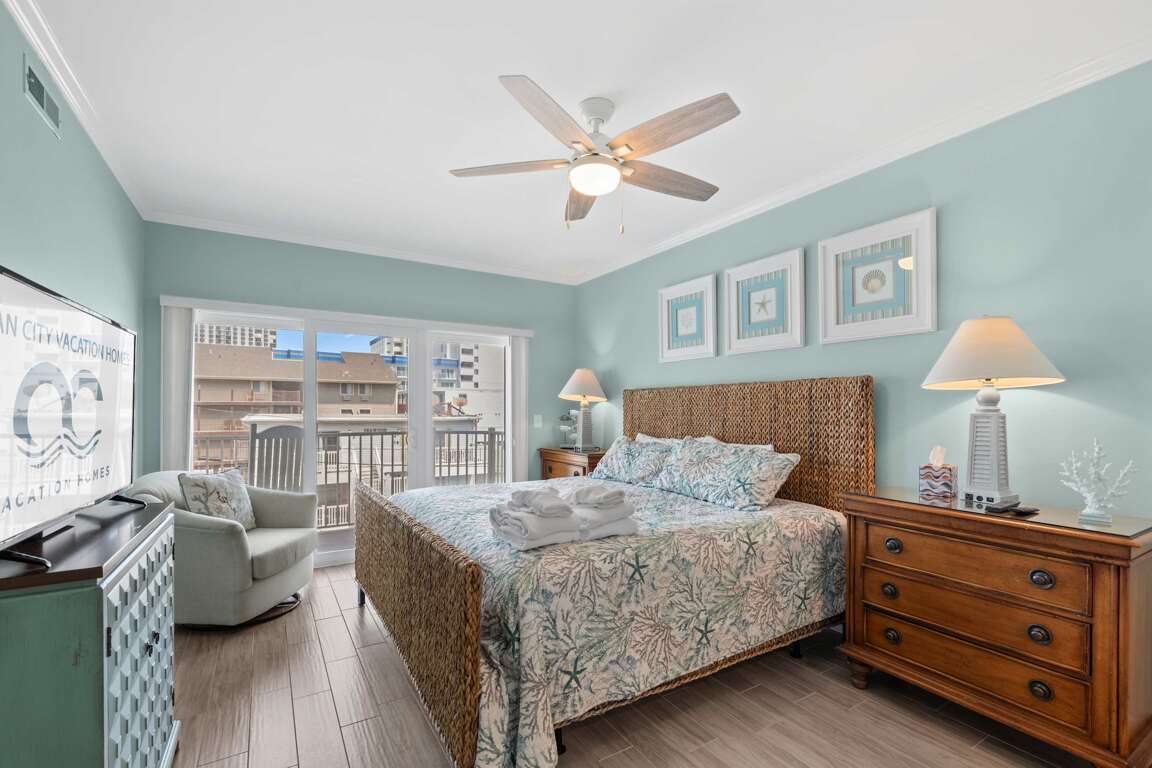 Bedroom 1: King bed, en suite bathroom, TV, balcony access