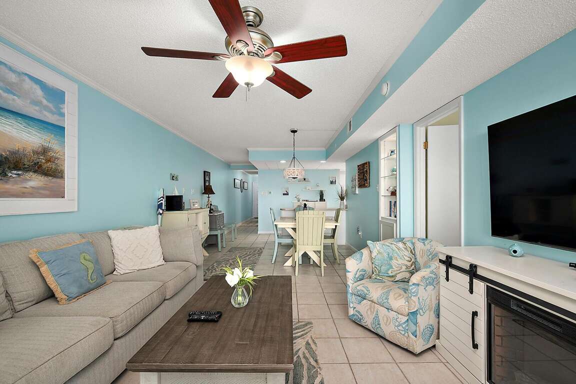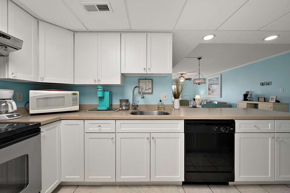 Comfortable and spacious Surfcaster 103 in Ocean City, MD with 2 bedrooms, a well-equipped kitchen with a dishwasher, and a relaxing living area with a television.