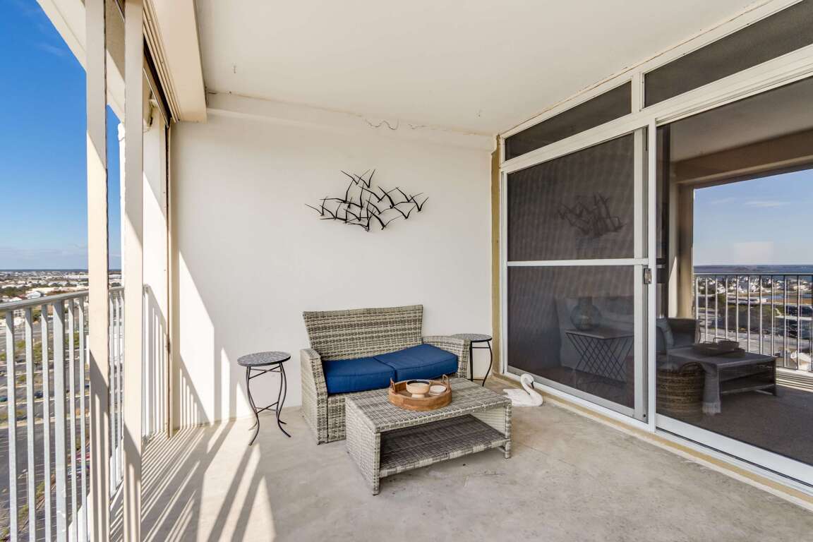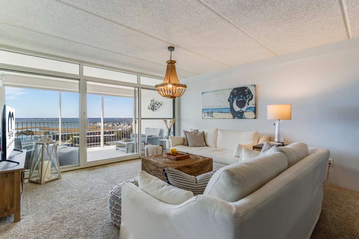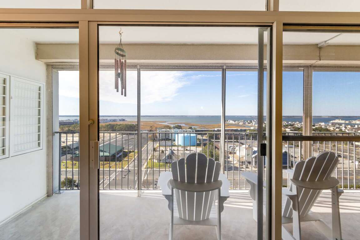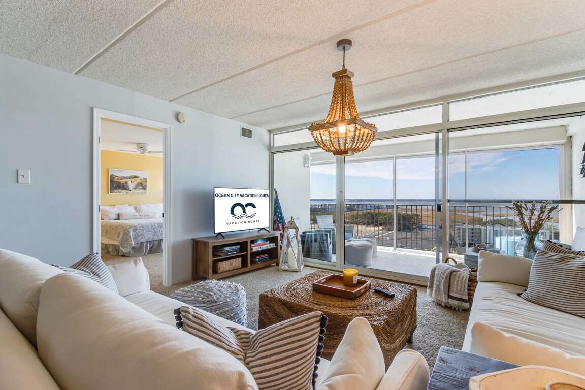 Escape to panoramic bayside beauty at English Towers 1406, a spacious 3-bedroom, 2-bath condo perched on the 14th floor with some of the most sweeping Assawoman Bay views in Ocean City. The highlight of this home is the large, private furnished balcony, accessible from both the living room and the primary bedroom — perfect for morning coffee, golden-hour sunsets, and peaceful evenings overlooking the water.