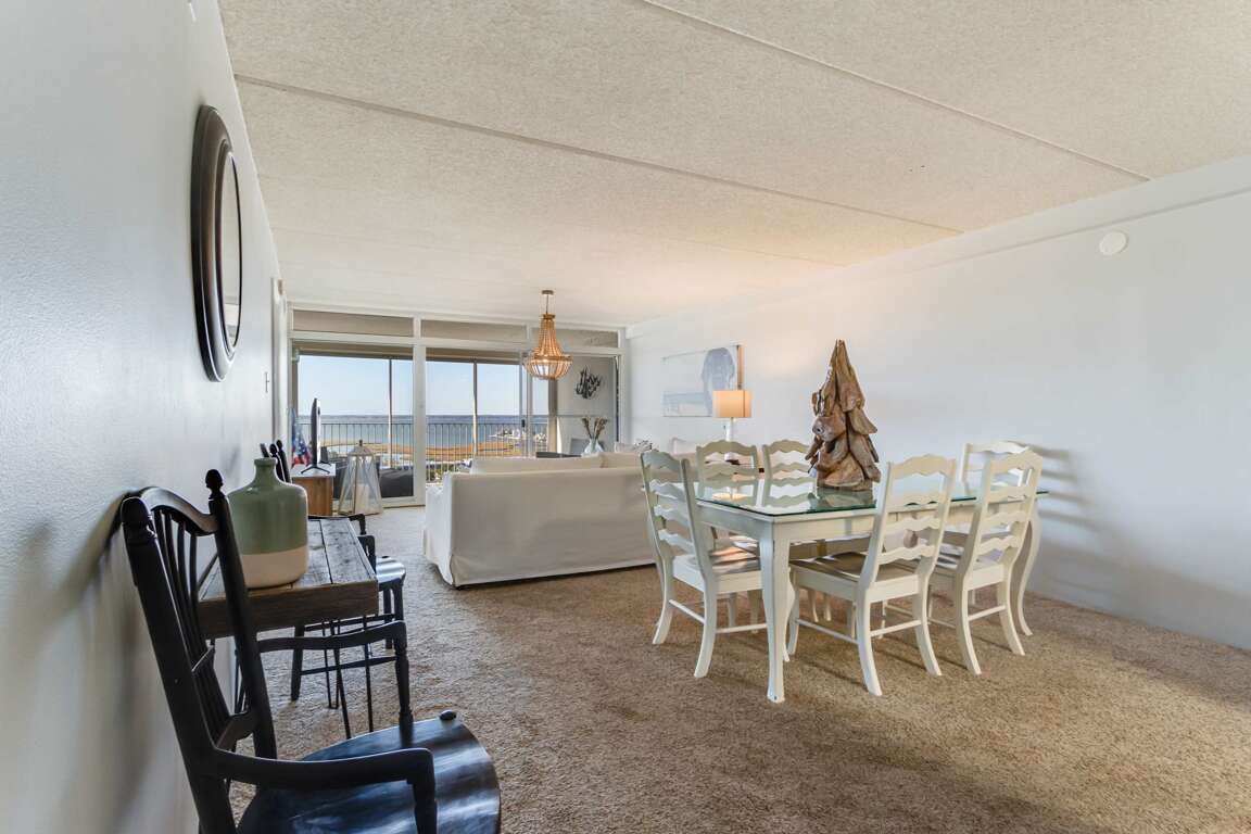 Inside, the open-concept living area features comfortable seating, a Smart TV for streaming, and floor-to-ceiling glass doors that fill the space with natural light. The fully equipped kitchen includes everything you need for home-cooked meals, along with bonus bay views while you prep. The primary bedroom includes a king bed, balcony access, and a renovated walk-in tile shower. Two guest bedrooms and a second full bathroom complete this relaxing bayside layout.