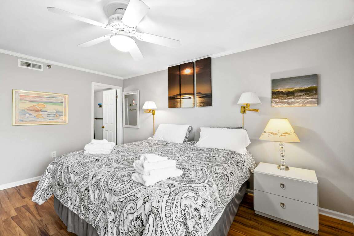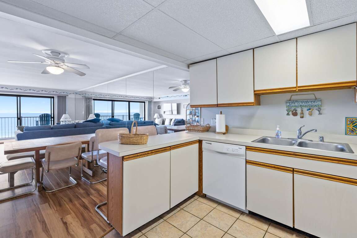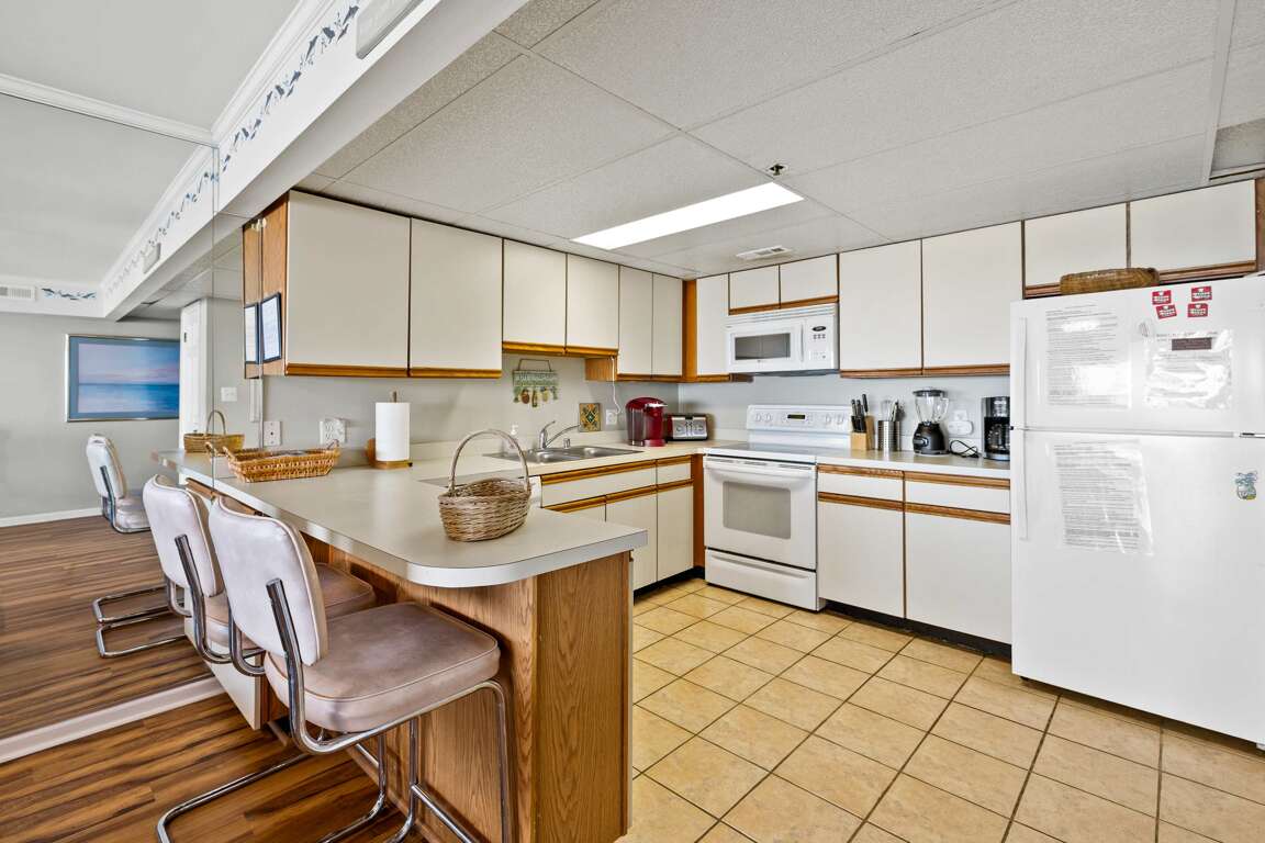With a king bedroom suite, a second bedroom that includes a queen bed and twin bed, and a queen sleeper sofa in the living room, this condo provides flexible sleeping options for families or small groups. The building also offers an outdoor shower for rinsing off after the beach.