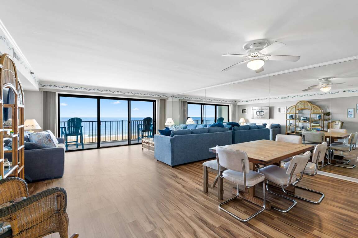 Inside, the layout is designed for comfort and connection. The living room features ample seating for relaxing after a day on the sand, a dining table with additional bench seating, and barstools at the kitchen counter for casual meals. Three wall-mounted Smart TVs throughout the home support streaming with your own logins, making it easy to unwind with your favorite shows or movies.