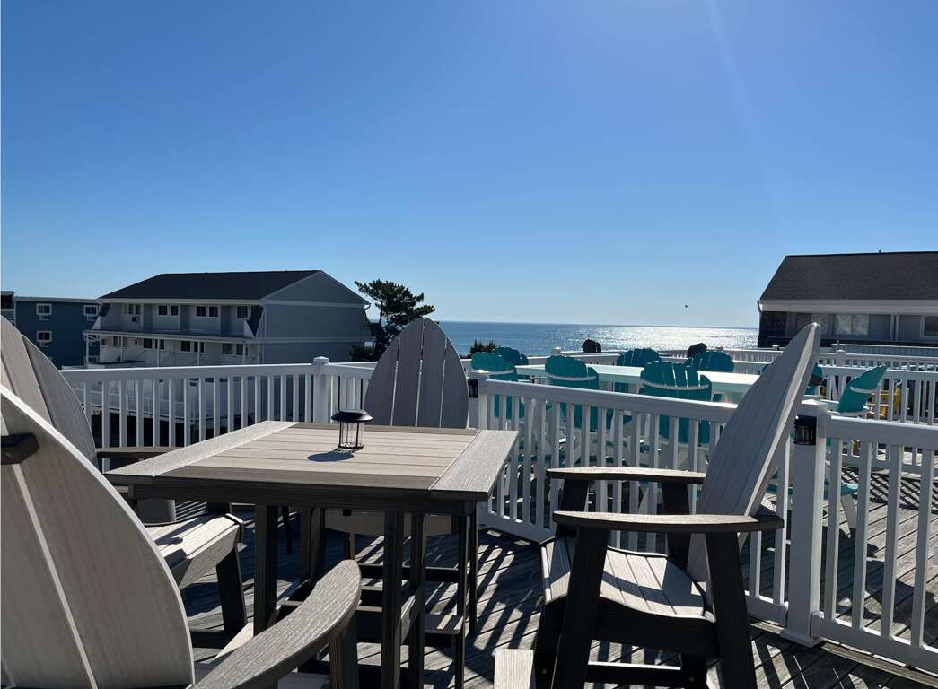 On the third floor, the king primary bedroom opens to a private deck with Adirondack chairs and ocean views. Another bedroom with two double beds shares a hall bath. The fourth-floor loft provides two twin beds and direct access to the rooftop deck with bar-height dining and panoramic views of the Atlantic.