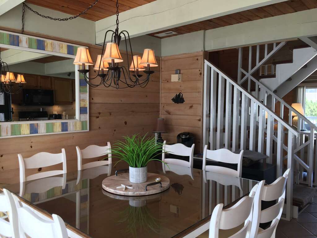 The main level includes a queen bedroom with ensuite bath and patio access leading to the sand courtyard and pool. Upstairs, the living room offers comfortable seating and a Smart TV with cable and streaming. The fully equipped kitchen has everything you need: a refrigerator with automatic ice maker, microwave, oven, dishwasher, drip coffee maker, Keurig machine, French press, coffee grinder, toaster, and complete cookware and dining sets for families. The dining area and rear deck overlook the pool and beach.