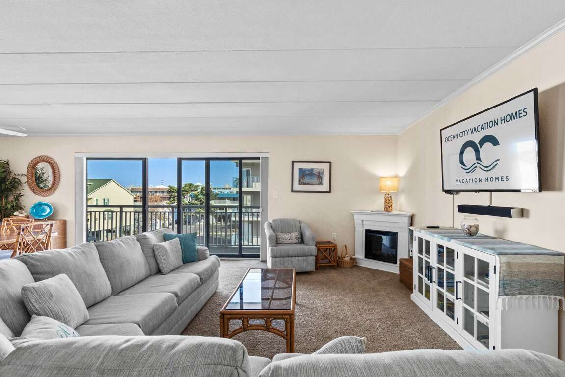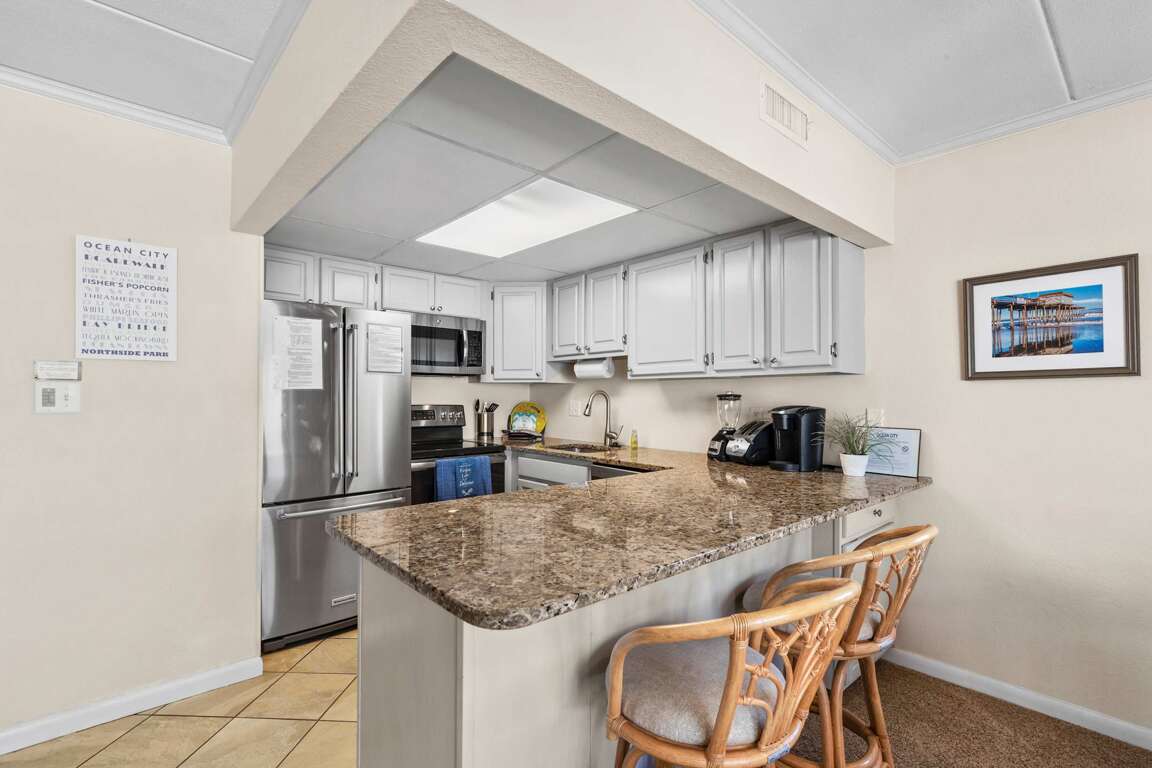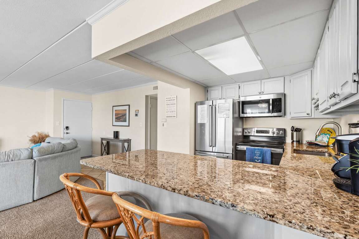 Inside, the Italian tile, granite counters, stainless steel appliances, and upgraded bathrooms create a sleek yet comfortable retreat. The open-concept living room features new furnishings, a Smart HDTV with soundbar, and direct access to the balcony. Cook in a fully equipped kitchen, gather around the dining table, or step out to enjoy Ocean City’s dining and attractions just minutes away.