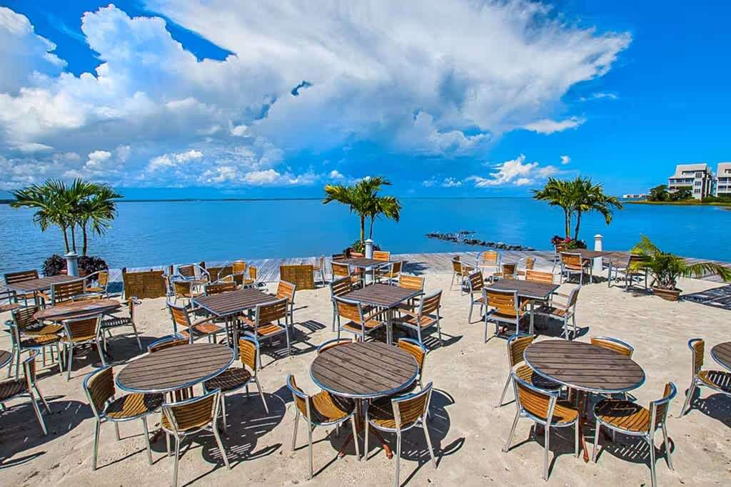✔ Sunset Island Bar & Grille with tiki bar, live music & bayfront dining (open seasonally)
