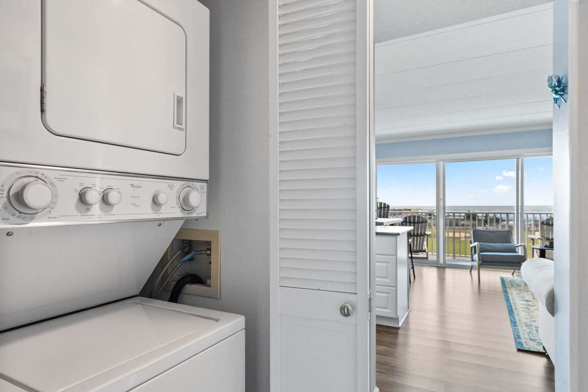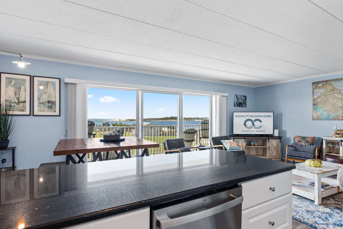 Inside, the open-concept living area is made for together time. Nearly floor-to-ceiling sliding glass doors frame the water and lead to your furnished balcony, while the living room’s Smart TV lets you stream your favorites between outings. The dining area sits beside a fully equipped kitchen—complete with refrigerator, stove, dishwasher, microwave, and a drip coffee maker (please bring your own grounds)—so breakfasts, snacks, and simple dinners are easy.