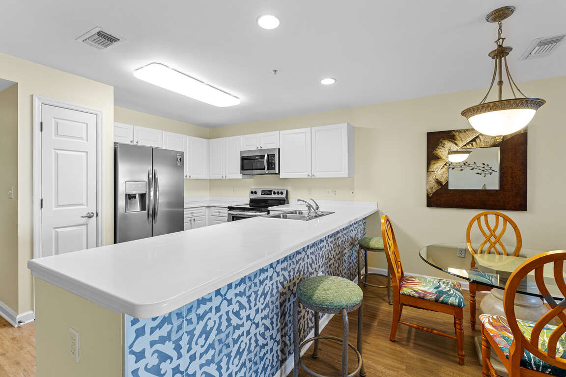 - Open kitchen with a counter bar, providing a spacious and social environment for meal preparation and dining.