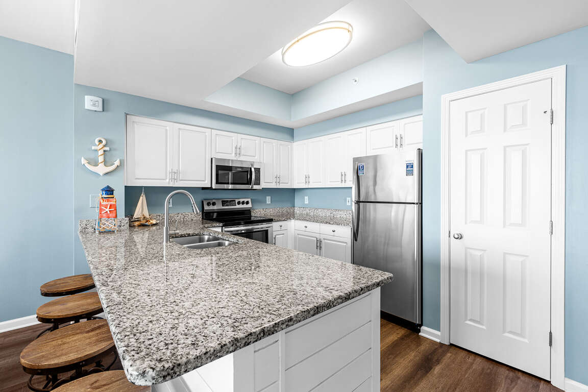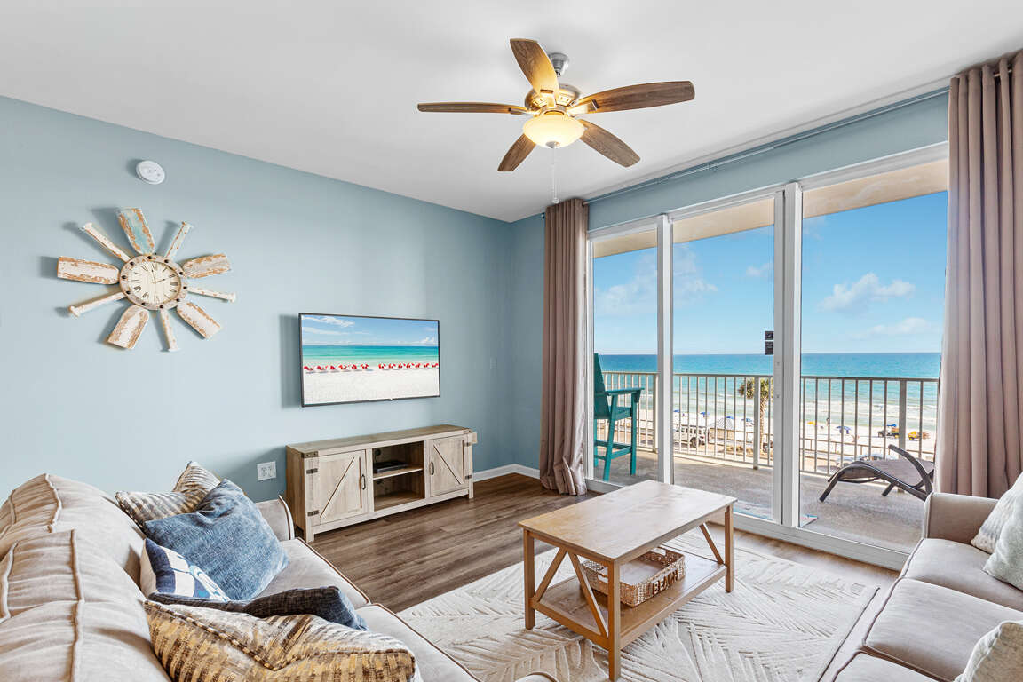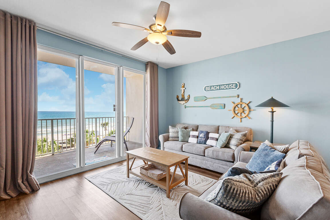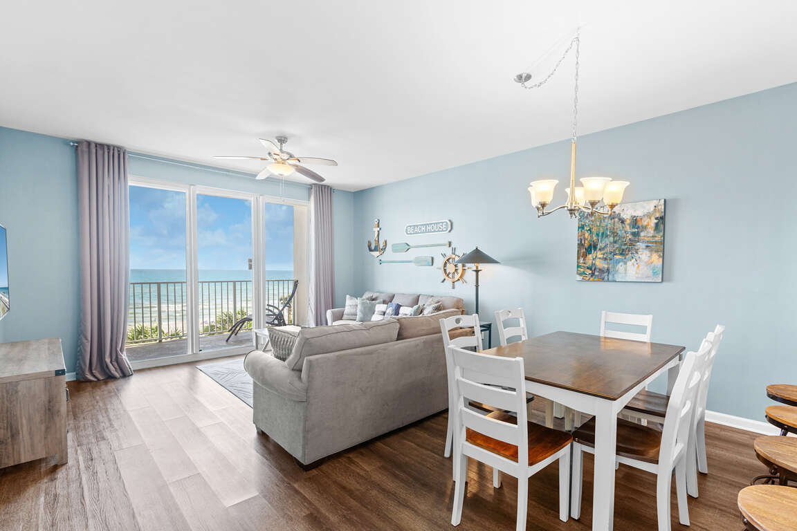 Majestic Sun 302B -Magic does exist! Witness your worries wash away instantly (as if by magic!) when you book your beach vacation at Majestic Sun 302B. This two-bedroom, two-bath condo recently underwent major renovations and is ready to provide a spectacular time for up to seven guests.Aside from extraordinary Gulf views, this residence includes a comfortably furnished open living area, balcony overlooking the beach, master bedroom, and guest bedroom.The open living area is furnished with coastal-inspired decor to include light-toned walls, rustic accents, and teal and coral colored accents that pop. The light gray wrap-around couch doubles as a queen-size sleeper sofa and faces both the breezy balcony and a wall-mounted TV. Six high-backed chairs surround the dining table, while the open kitchen provides additional seating at the granite-topped bar. The open concept floorplan is perfect for entertaining guests, a relaxed evening indoors, or an intimate gathering with friends and family. Glass doors open from the living room onto the Gulf-front balcony which boasts spectacular views of the beach as far as the eye can see. With a comfortable setup of table and chairs, it is easy to enjoy the views, your favorite drink, the sounds of the surf, and good company while you hang out on the balcony.The stylish master suite includes a king-size bed, luxurious en-suite bath, and doors that open onto the balcony. The guest bedroom features a unique bunk setup, with a queen-size bed on the bottom and an elevated twin bed above. Besides comfortable living space, the Majestic Sun offers its guests a number of fantastic amenities, including an indoor/outdoor pool and full fitness center. Ocean Reef Resorts guests also receive discounted rates on golf and tennis at the nearby Seascape. This condo is also ideally located near popular restaurants, discount shopping, seasonal festivals and events, and more.Third Floor:All One Level: Living Room with Queen Sleeper Sofa and Balcony Access, Kitchen, Dining, King Master Bedroom with Tub/Shower Combo and Balcony Access, Bunk Room with Queen/Twin Bunk and Shared Tub/Shower Combo, Laundry.*Two complimentary parking passes are provided. Additional passes may be purchased for $15.00 each. Monthly winter guests must purchase a parking decal for $25.00 once the complimentary parking pass expires after 15 days.*Majestic Sun is a smoke free environment with smoking and chewing tobacco prohibited in all common areas, including the garage, walkways, pools spa, and pool decks, as well as on the balconies.*Based on the daily temperature and at the HOA's discretion, the community pool is seasonally heated.*Note This property may have date restrictions that apply. All reservations submitted online are a request until receiving an email confirmation from Ocean Reef Resorts. For more details, please review our Minimum Night Stay under Rental Policies. An e-signed rental agreement is required prior to arrival.
