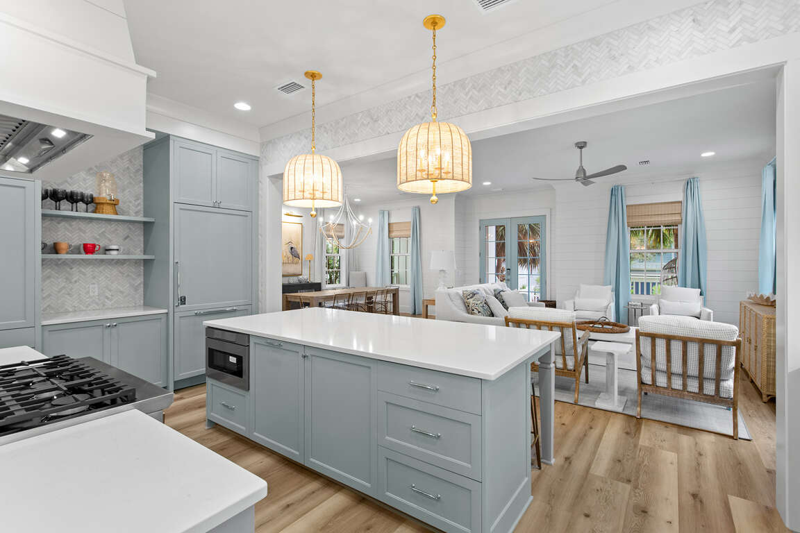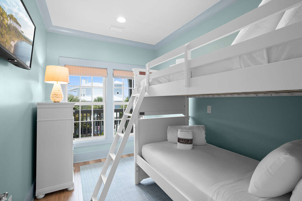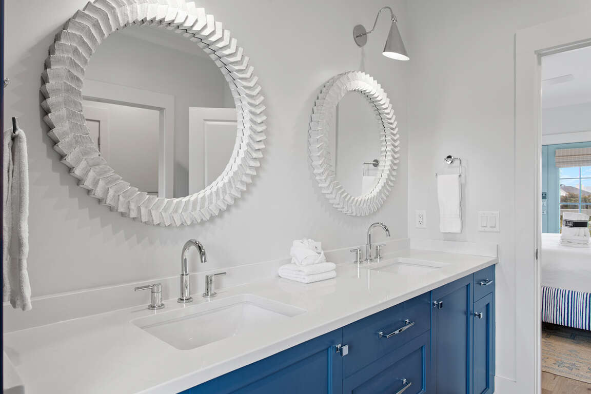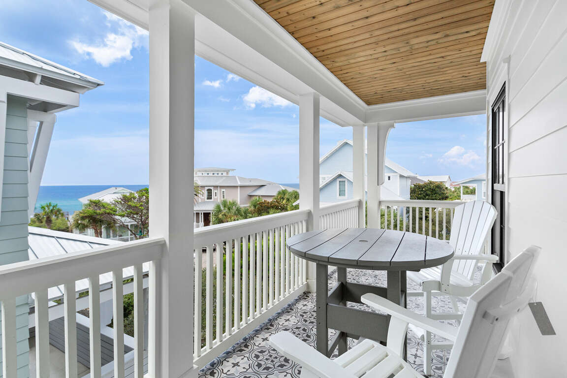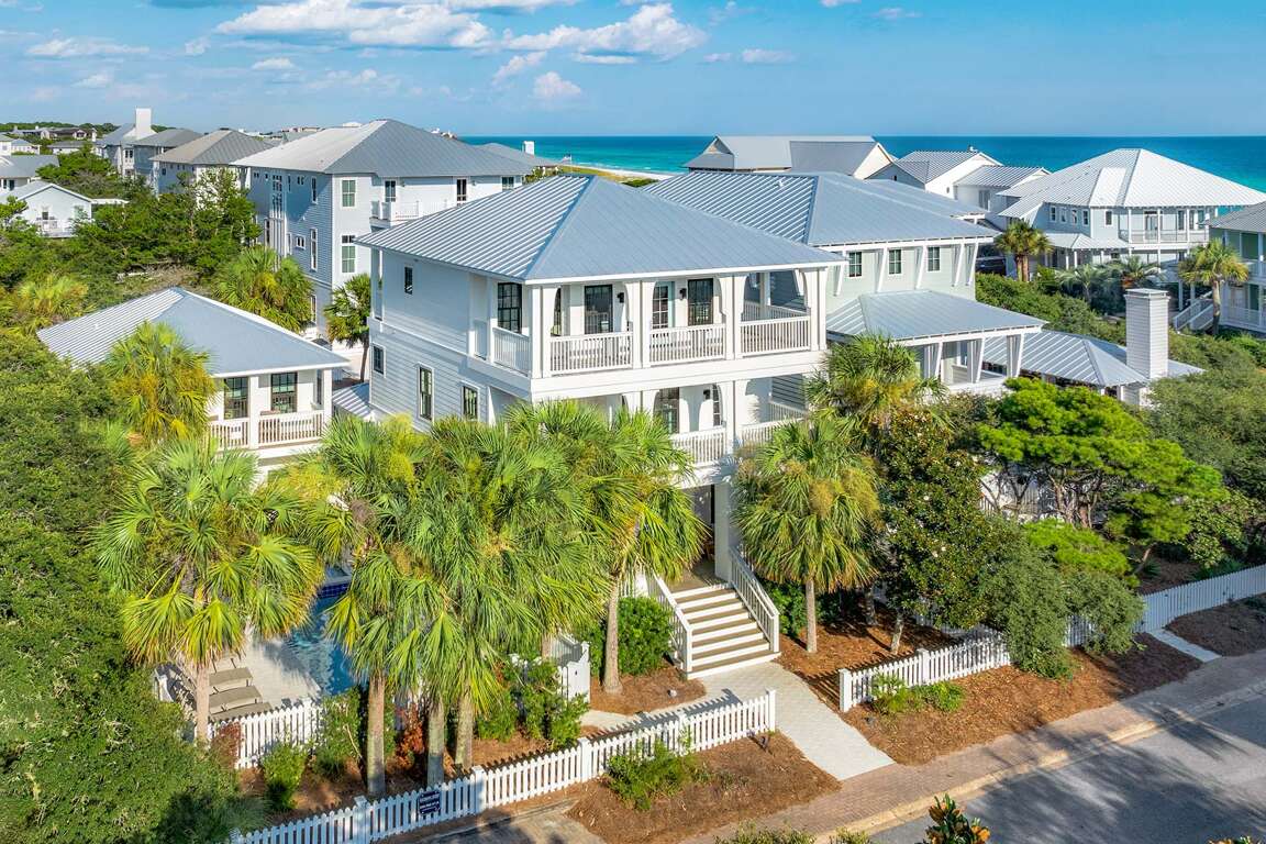 With a layout designed to accommodate up to 13 guests, the house and carriage house of this charming 6-bedroom vacation home in Old Florida Beach provide ample space and comfort for a luxurious stay. The interior design is a perfect blend of coastal charm and modern comfort, offering a large living room, a full kitchen, a dining room, and a half bathroom on the first level of the main house. The second level features a queen bedroom with a shared bathroom, a double twin bedroom, and two twin bunk rooms, each with its own private bathroom. The third level boasts a spacious king master bedroom with a large private bathroom. Additionally, the carriage house includes a queen bedroom, a twin bedroom, a living room, a full kitchen, and a shared hall bathroom. Moreover, the property features a private pool and balconies with views of the gulf, making it an ideal place to unwind after exploring the neighborhood attractions.