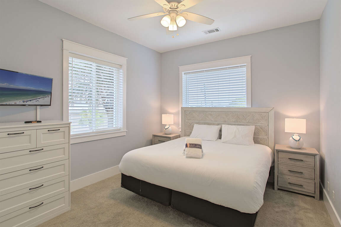Nestled on the first floor, guests will find a spacious guest bedroom with a king-size bed, complemented by a bonus living space, a convenient wet bar, and direct access to the inviting pool deck. The guest room offers freedom and privacy, providing a comfortable retreat for those seeking relaxation. The bonus living space features a wraparound couch and a TV, perfect for unwinding after a day of beach activities. The addition of a wet bar adds a touch of luxury, allowing guests to easily prepare and enjoy their favorite beverages. With seamless access to the pool deck, guests can effortlessly transition between indoor and outdoor leisure, making the most of their beachside escape. This floor also boasts a full hall bath, ensuring convenience for all occupants.