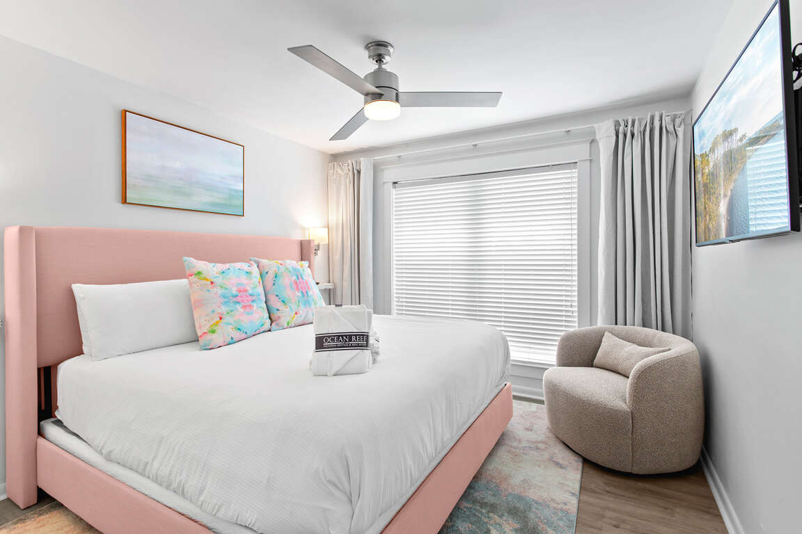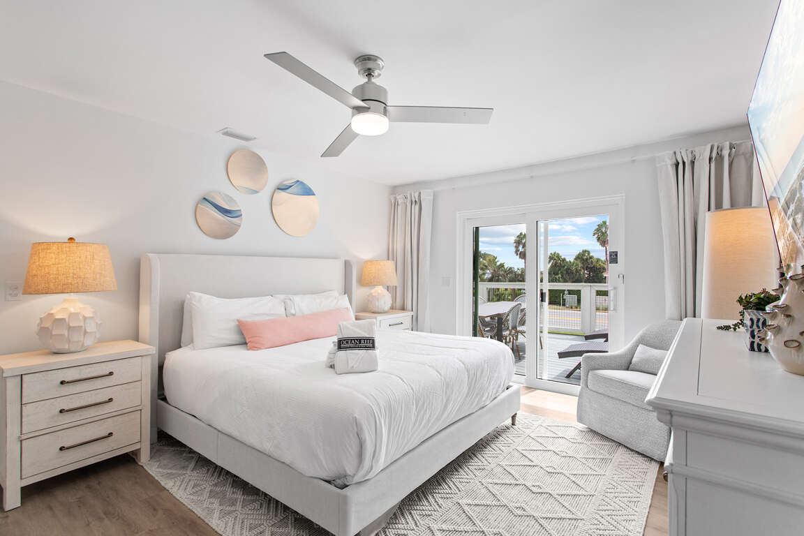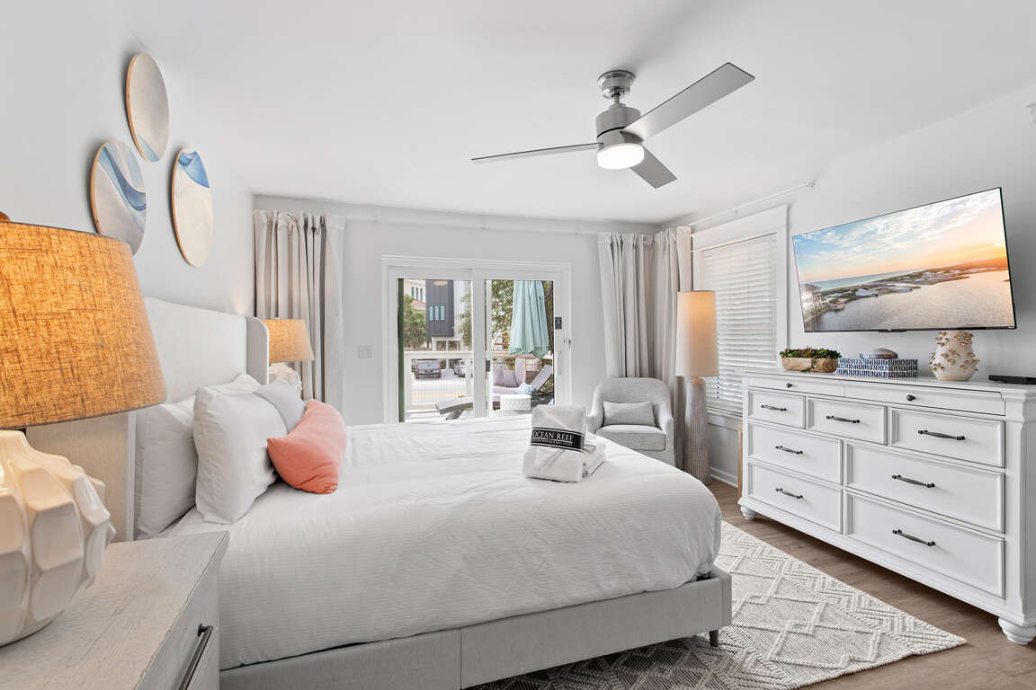 - Charming primary suite with a king-size bed, reading corner, wall-mounted TV, and balcony access.