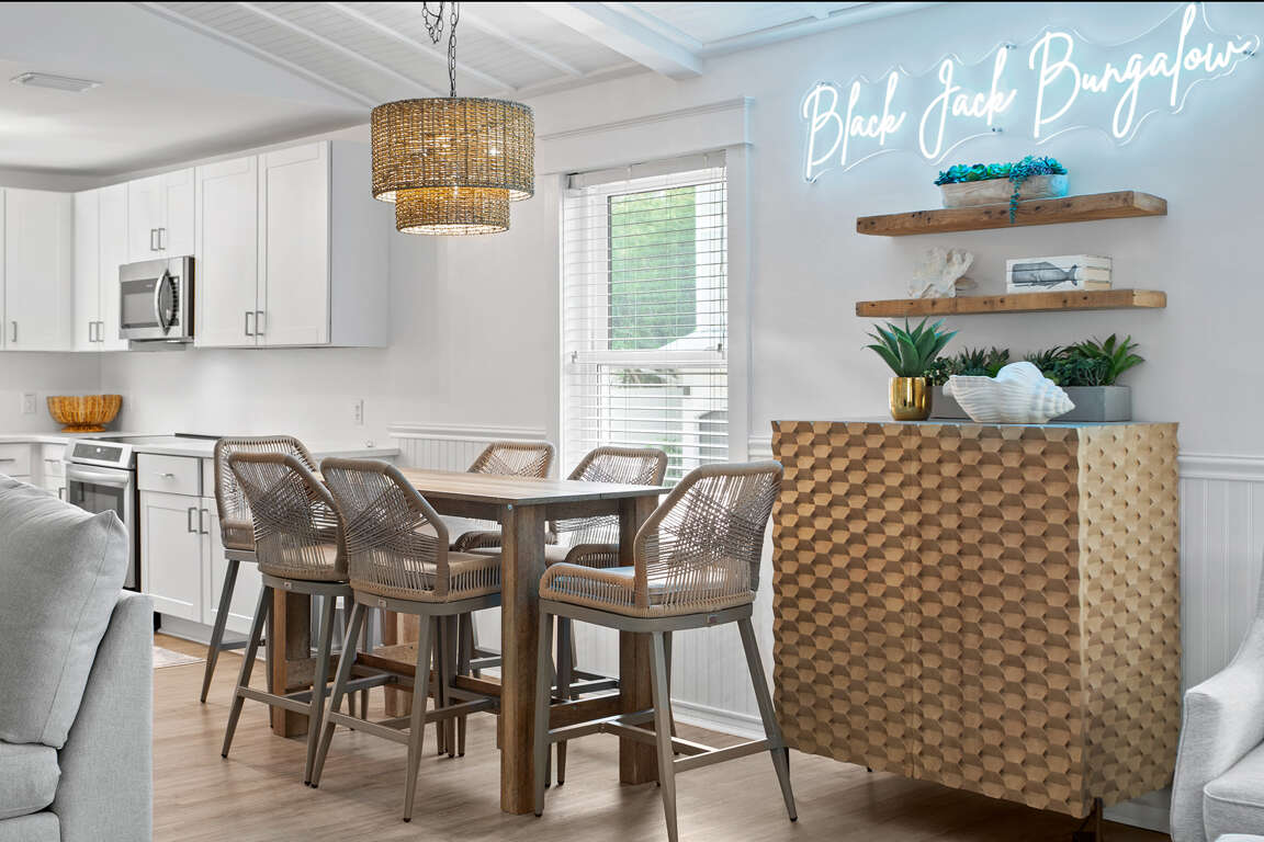 With a rooftop deck offering incredible coastal views, a private pool, and access to a complimentary six-seater golf cart and four bikes, the Black Jack Bungalow provides a delightful array of amenities and perks for a luxurious vacation experience. The private pool, nestled in a beautifully fenced-in backyard, offers the perfect spot for a refreshing dip or leisurely lounging. Additionally, the fully equipped kitchen with granite countertops and stainless steel appliances allows guests the freedom to prepare their favorite meals or snacks. Whether it's a poolside barbecue or a gourmet dinner, the kitchen provides a versatile space for culinary creativity. These amenities, along with the breathtaking rooftop views and convenient transportation options, ensure that every aspect of your stay at Black Jack Bungalow is filled with comfort and convenience.