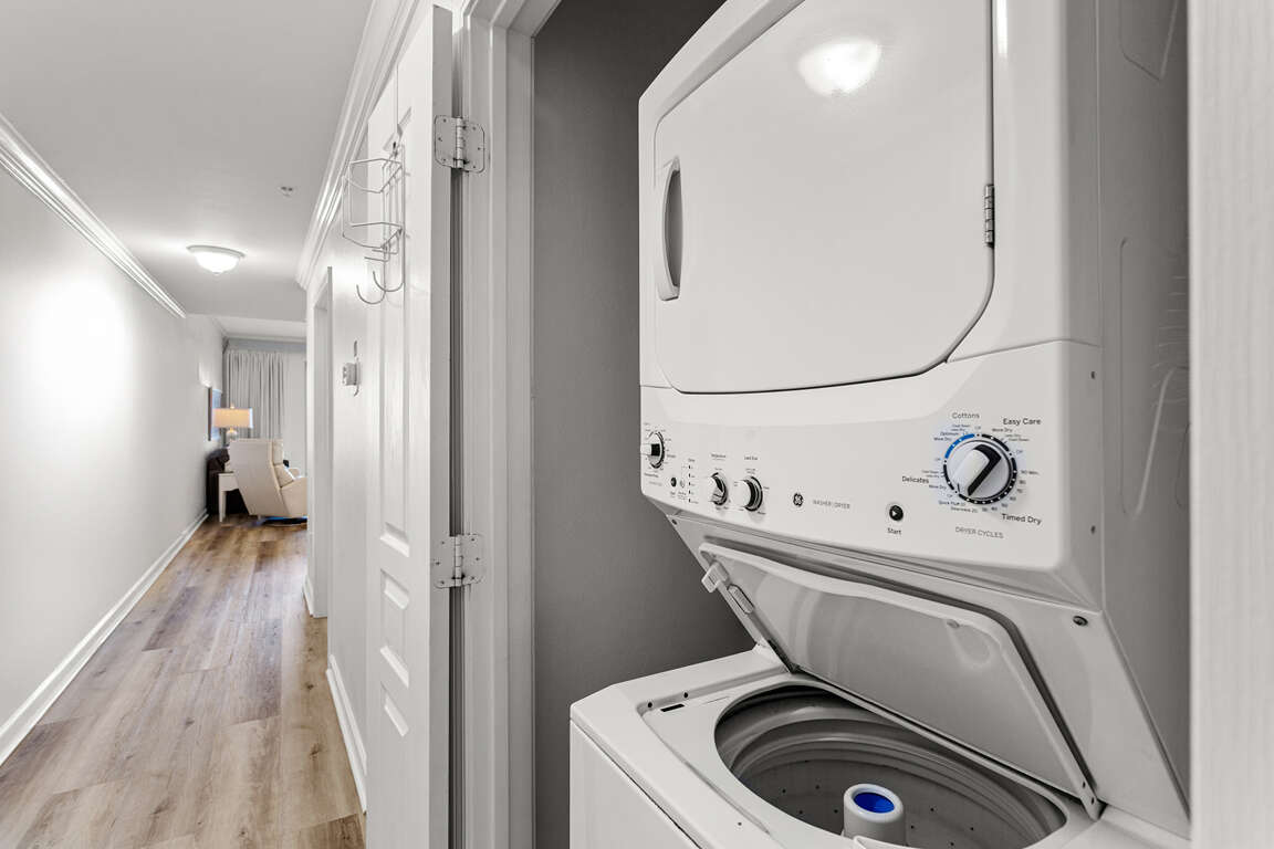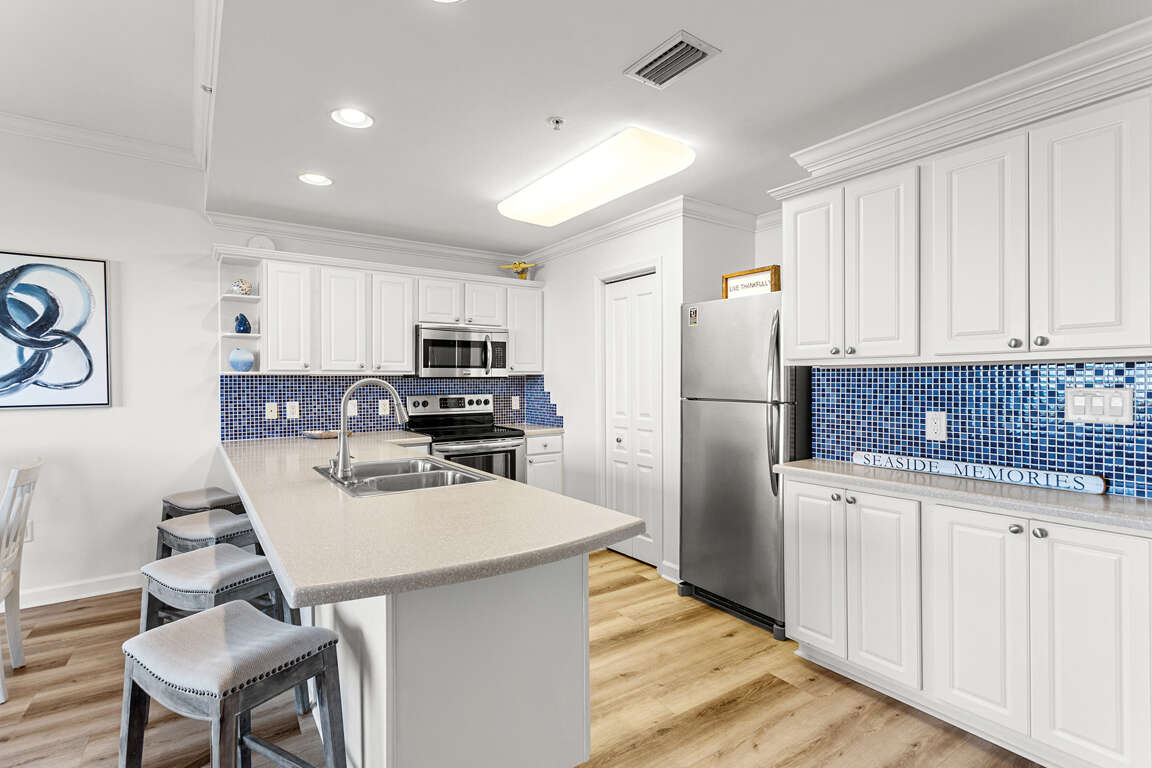 The fully equipped kitchen at Luxury Beach Resort 508 is a haven for kitchen creativity, allowing guests the freedom to indulge in culinary adventures. The light quartz-topped bar and cushioned stools provide a comfortable space for meal preparation and casual dining. The nautical blue mosaic backsplash adds a touch of coastal charm, further enhancing the experience of creating and enjoying delicious meals in this inviting space.