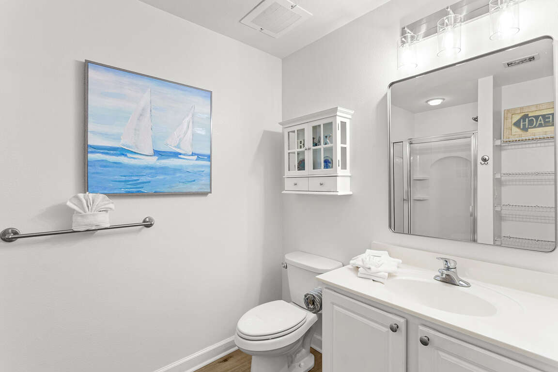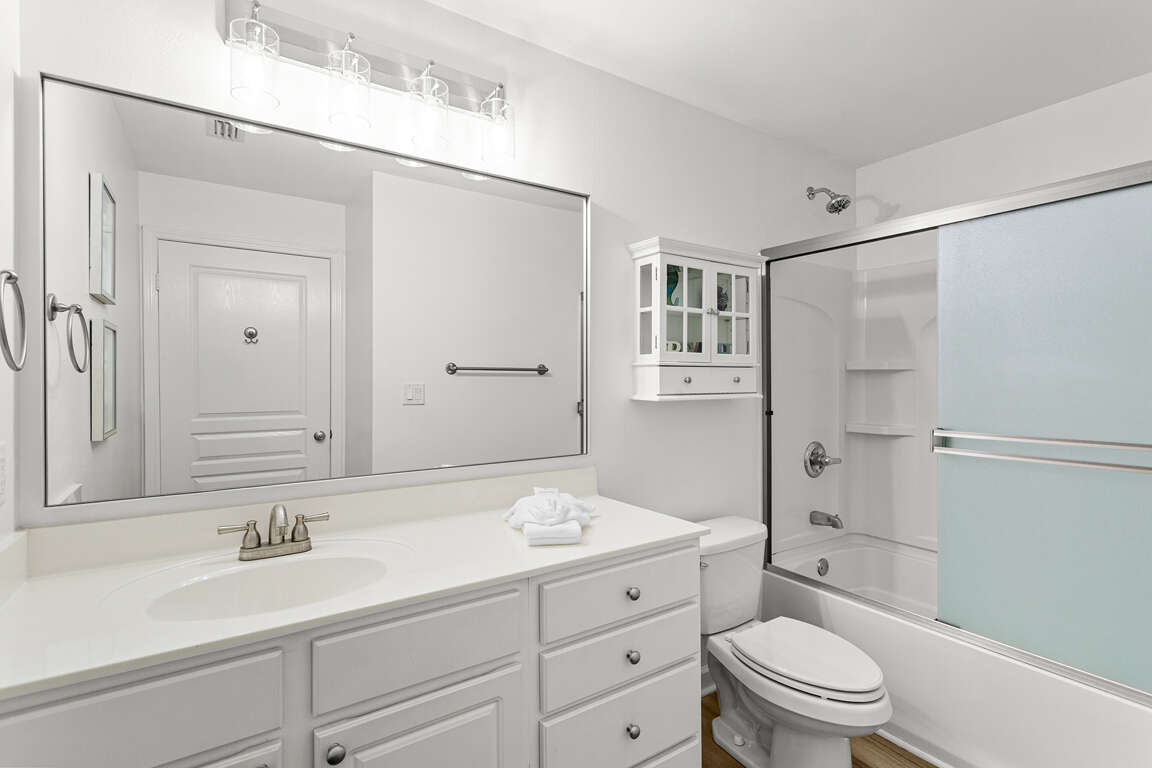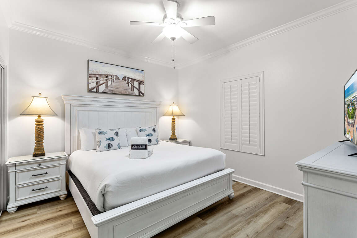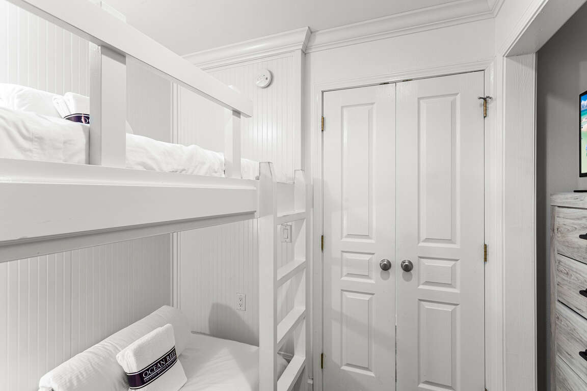 Indulge in serene tranquility and rejuvenating comfort within the primary bedroom of Luxury Beach Resort 508, featuring a luxurious king-size bed and white cottage-style furnishings, creating an inviting escape for a peaceful rest. The bright ensuite bathroom with a tub-shower combination adds to the relaxing ambiance, complemented by a cozy twin bunk nook for extra guests and a separate full bathroom with a walk-in shower. Unwind in the peaceful and relaxing atmosphere, embracing the tranquil surroundings and comfort of the bedroom and bathrooms. Whether it's a restful night's sleep or a rejuvenating afternoon nap, this space provides the perfect setting for unwinding. From the plush king-size bed to the cozy bunk nook, this tranquil retreat offers a range of relaxation options for a truly restful stay.