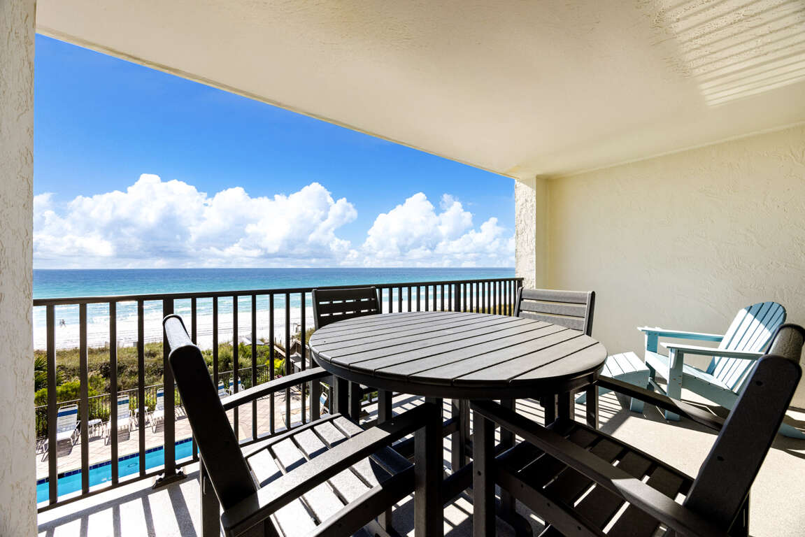- Condo Layout: Third-floor unit featuring two bedrooms, two baths, a sunlit living room, a dining area, and a spacious kitchen. The beachfront balcony provides panoramic views of the Gulf and overlooks the complex's pool.