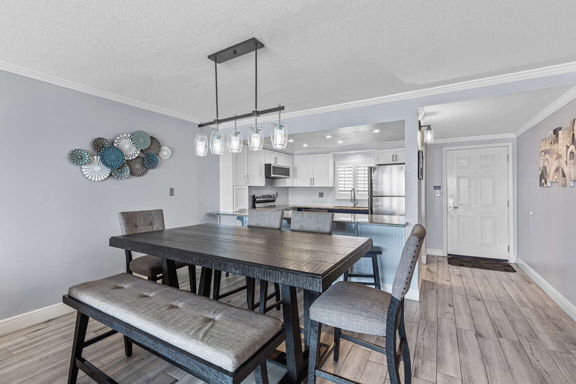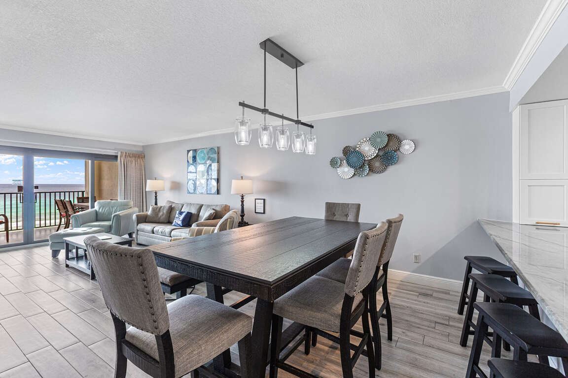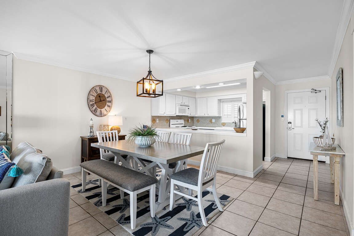 The interior of Huntington By The Sea 302 exudes a relaxed coastal ambiance, featuring tile floors, earth-toned furnishings, and a spacious open floor plan with a sunlit living room, dining area, and a well-appointed kitchen. The tile flooring throughout the condo adds to the beachy vibe, making it easy to clean up after a day at the beach. The beachfront balcony provides a perfect spot to enjoy the stunning views of the Gulf and the condo complex's pool. The living room boasts a wall of mirrors, creating a spacious atmosphere, while plush couches and an armchair face a flatscreen TV. The dining area features a handsome table and six high-backed chairs, and the open kitchen is equipped with white cabinetry, tile counters, and white appliances, making it ideal for preparing meals.