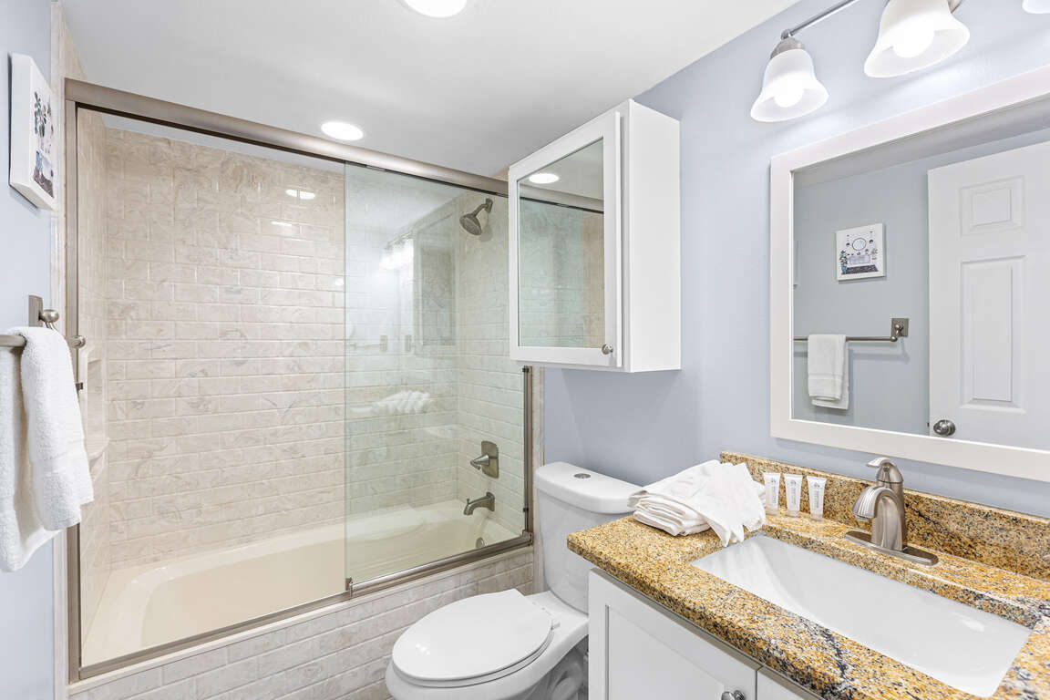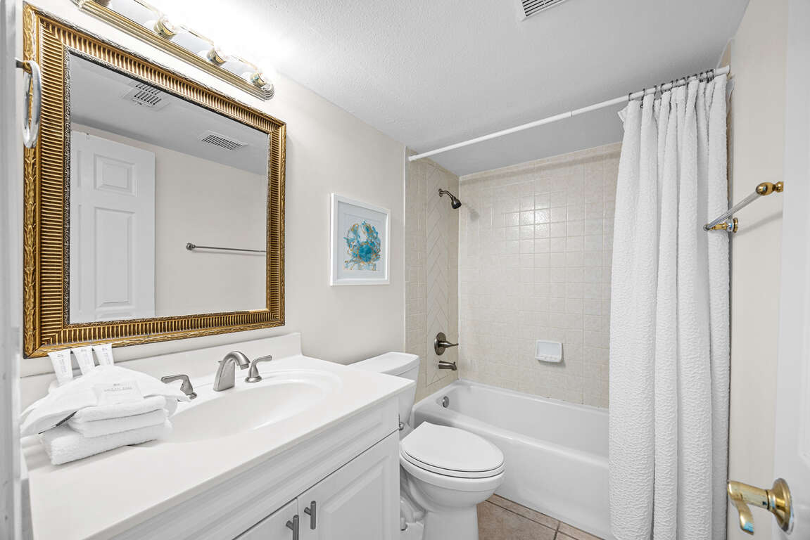 Both bedrooms in Huntington By The Sea 302 feature queen-size beds and are thoughtfully decorated to provide a comfortable and inviting retreat for guests. The primary bedroom boasts a decorative headboard and footboard, while the guest bedroom features colorful decor and a flatscreen TV. The primary bedroom offers a full wall of sliding glass balcony doors, providing stunning Gulf views. Additionally, there is a convenient hall bath with a full tub/shower for the guest bedroom. The sleeping arrangements are ideal for a group of up to 6 guests, with the queen sleeper sofa in the living room providing additional sleeping space. The bedroom decor is charming and complements the laidback feel of the entire property, ensuring a relaxing and enjoyable stay for all.