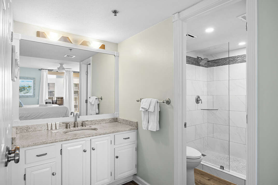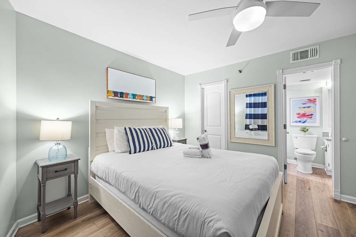 Seventh-floor condo in Miramar Beach with 2 bedrooms, a king primary suite, kitchen, laundry, and balcony access—an easy vacation rental place to stay.