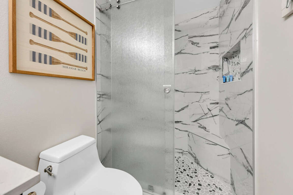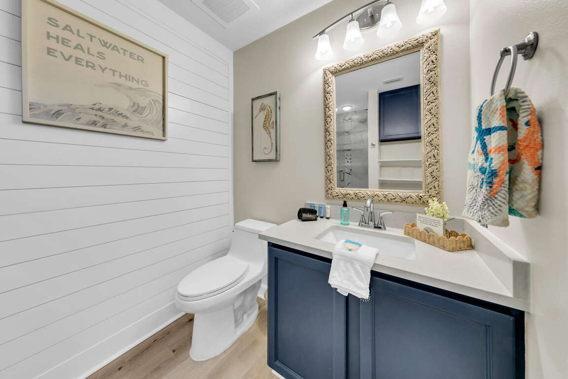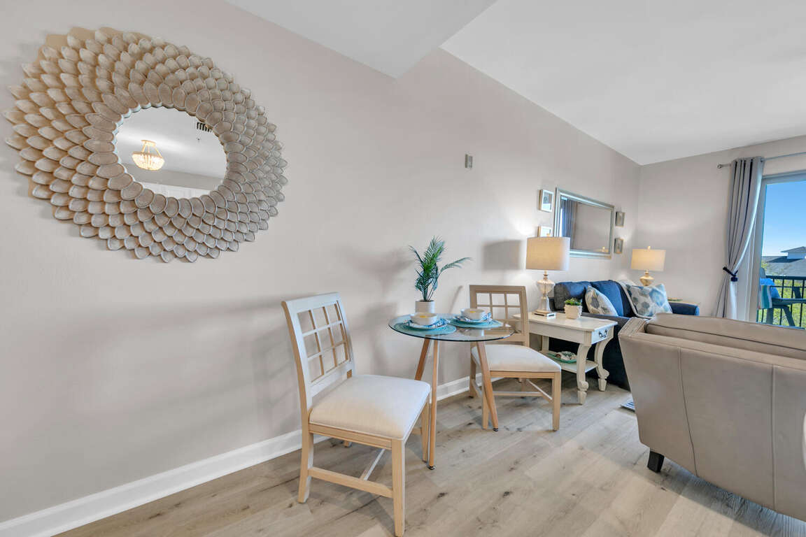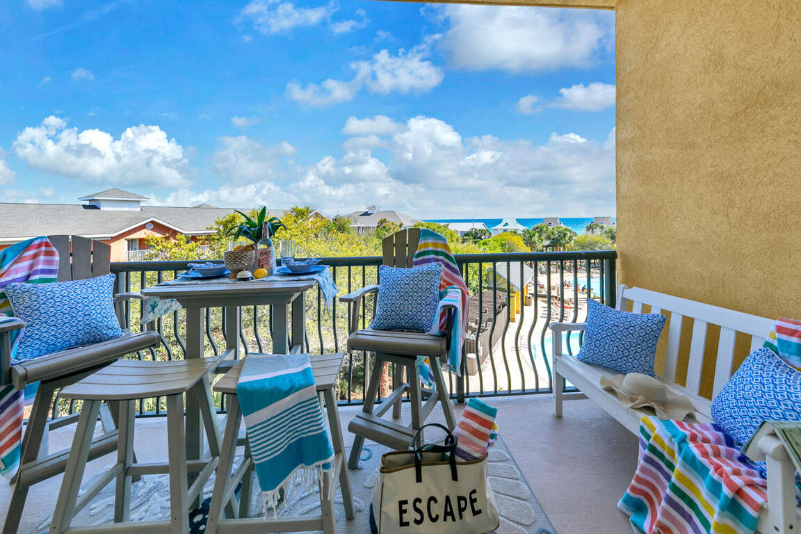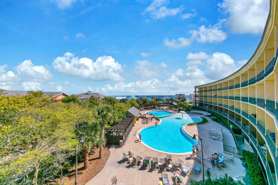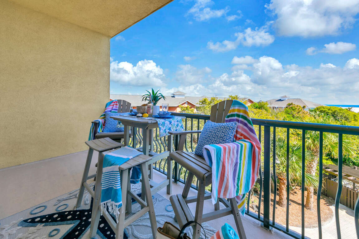 Fourth-floor condo vacation rental in Miramar Beach with a king bedroom, twin bunk nook, sleeper sofa, balcony, laundry, and access to a community pool.