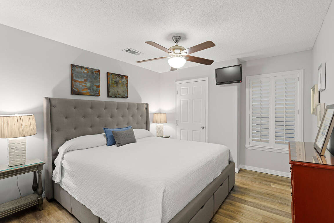 One-level condo vacation rental in Santa Rosa Beach with two king bedrooms, a twin bunk nook, balcony access, and in-unit laundry for easy stays.