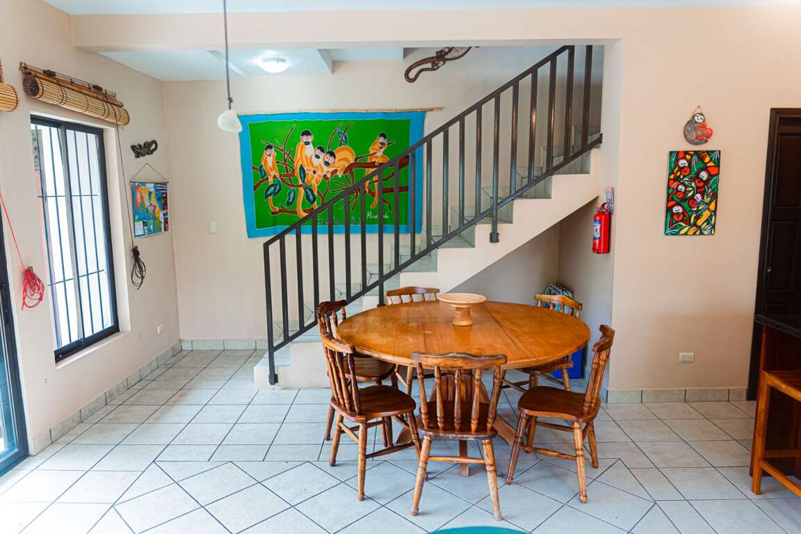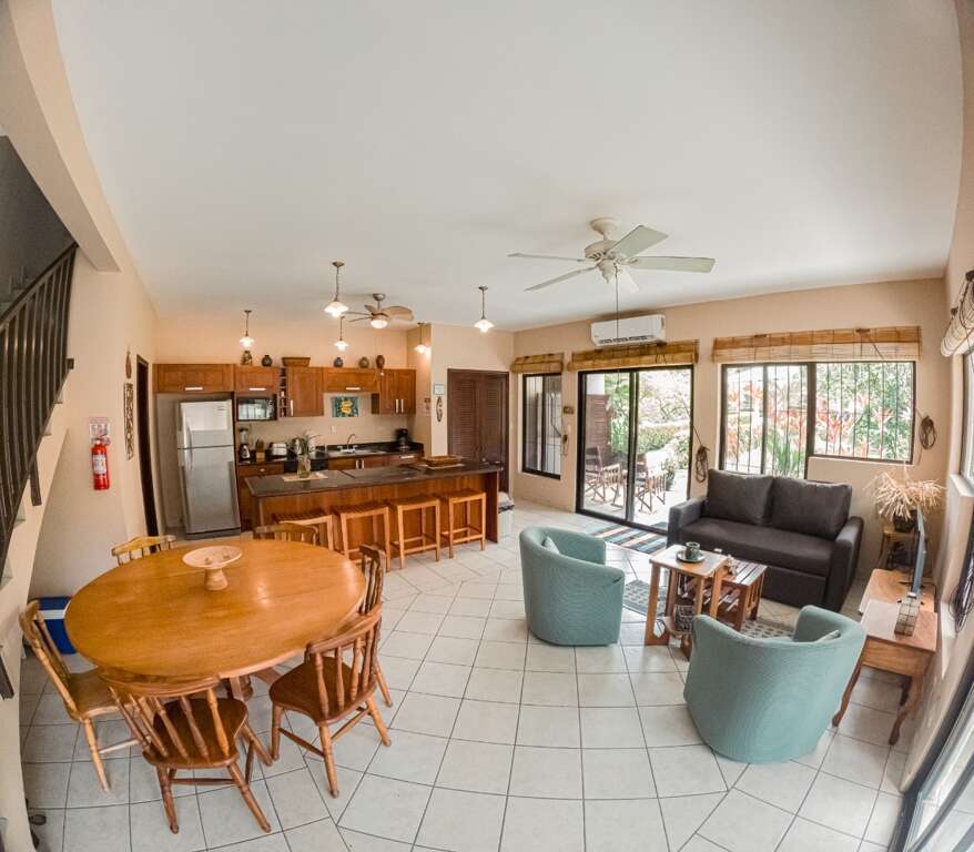 On the first floor, the open floor plan allows easy flow between the kitchen, the kitchen island the living room, dining area and main floor outdoor patio space, which faces a lush jungle.