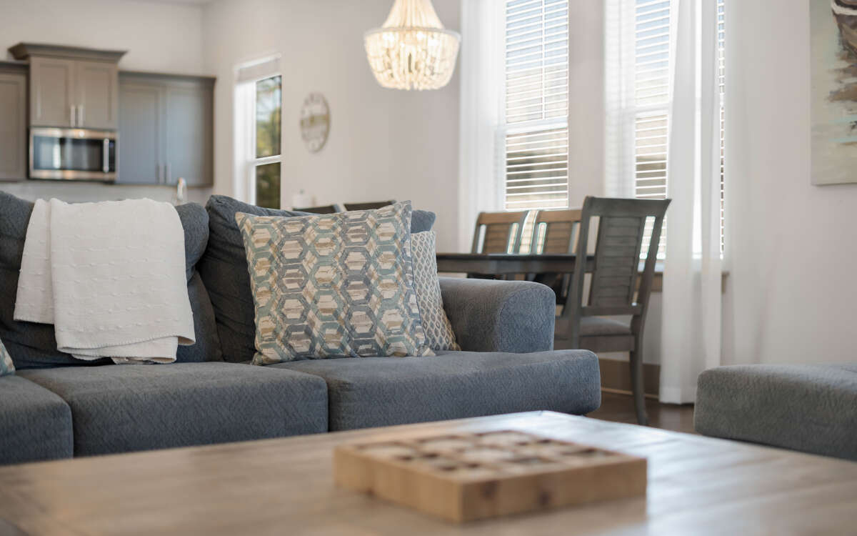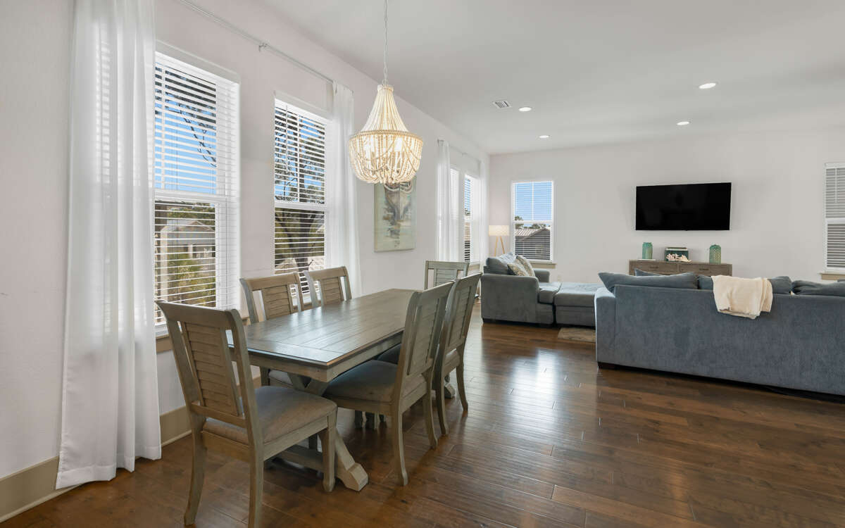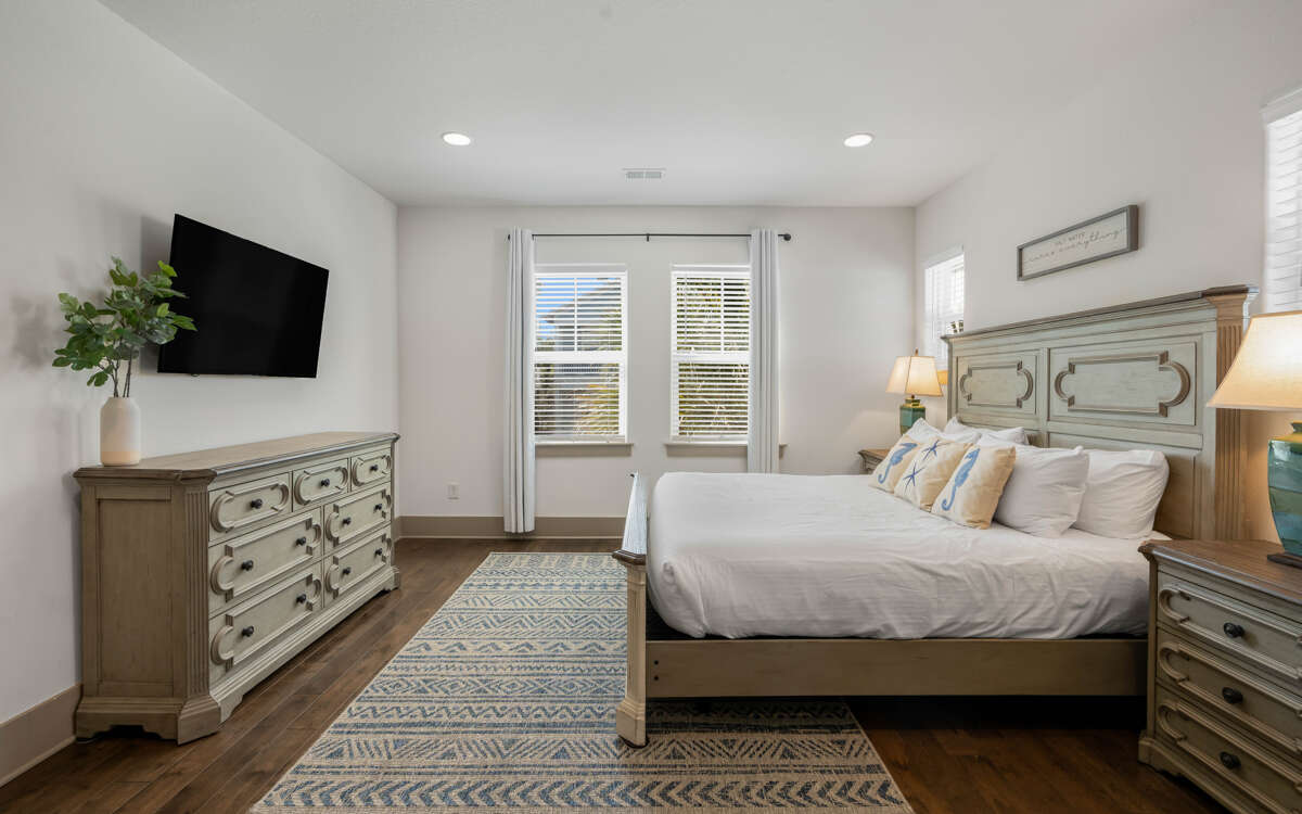 Inside, a massive family room opens to a fully equipped kitchen, and a guest room, king, with a full bath. A second living area and three bedrooms are on the second floor. A primary bedroom, king, has a seating area and en-suite bathroom, with a spacious shower. A guest room, queen, is down the hall, as is a queen bed and the kids favorite, a bunk room with two sets of twin bunks, sleep four. The house has ample parking for 3-4 cars, or 3 cars and a golf cart.