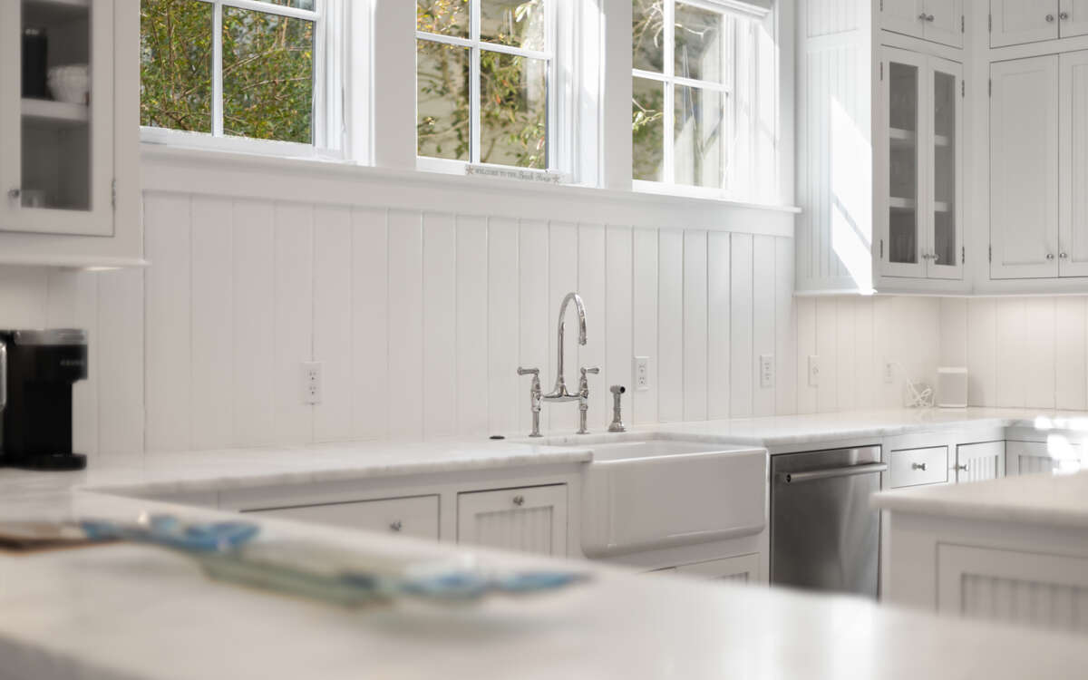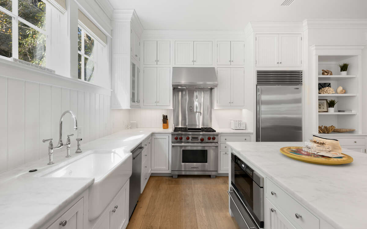 Inside, the bright and inviting first floor includes a grand dining room table, a full kitchen, and a spacious living area. Nearby is a primary bedroom, king, with an en-suite bathroom. But the star of the floor? The stunning wrap-around porch invites all to its gentle breezes.