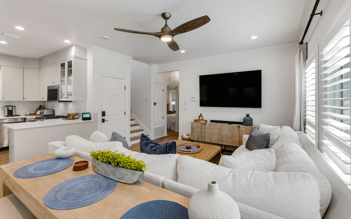 Upstairs, each bedroom includes a Samsung Smart TV, giving everyone their own entertainment space. But the third-floor primary suite? It steals the show with a vaulted ceiling, private bath, and a big deck where the sound of waves sets the mood.