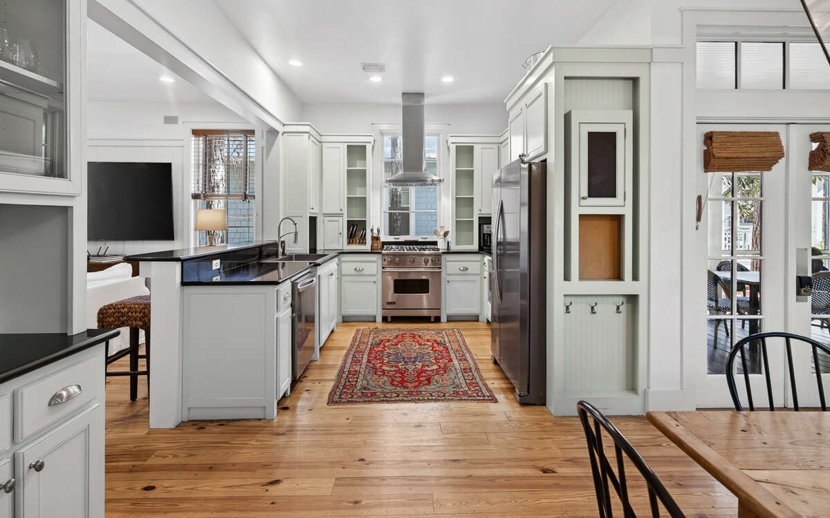 The kitchen is well equipped for everything from laid-back breakfasts to full family dinners, with seating for eight at the table and a few extra spots at the bar. The first-floor primary suite keeps things convenient, featuring a king bed and a spacious bath with soaking tub and separate shower.