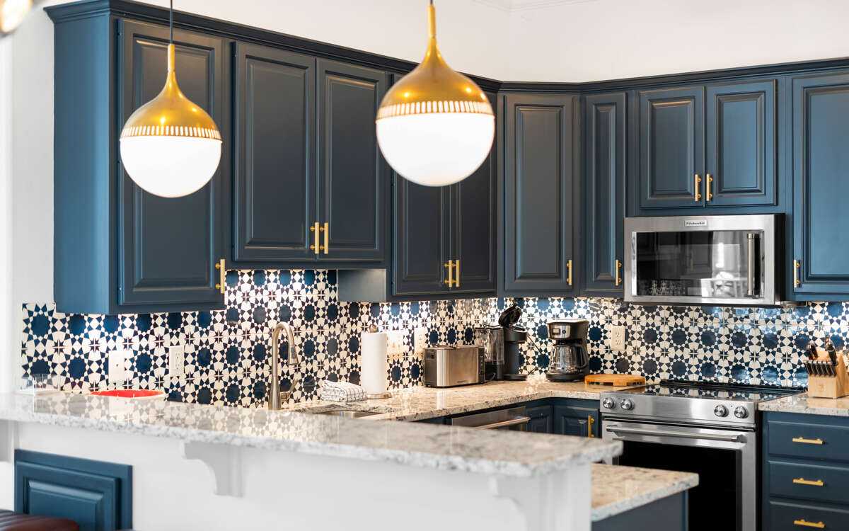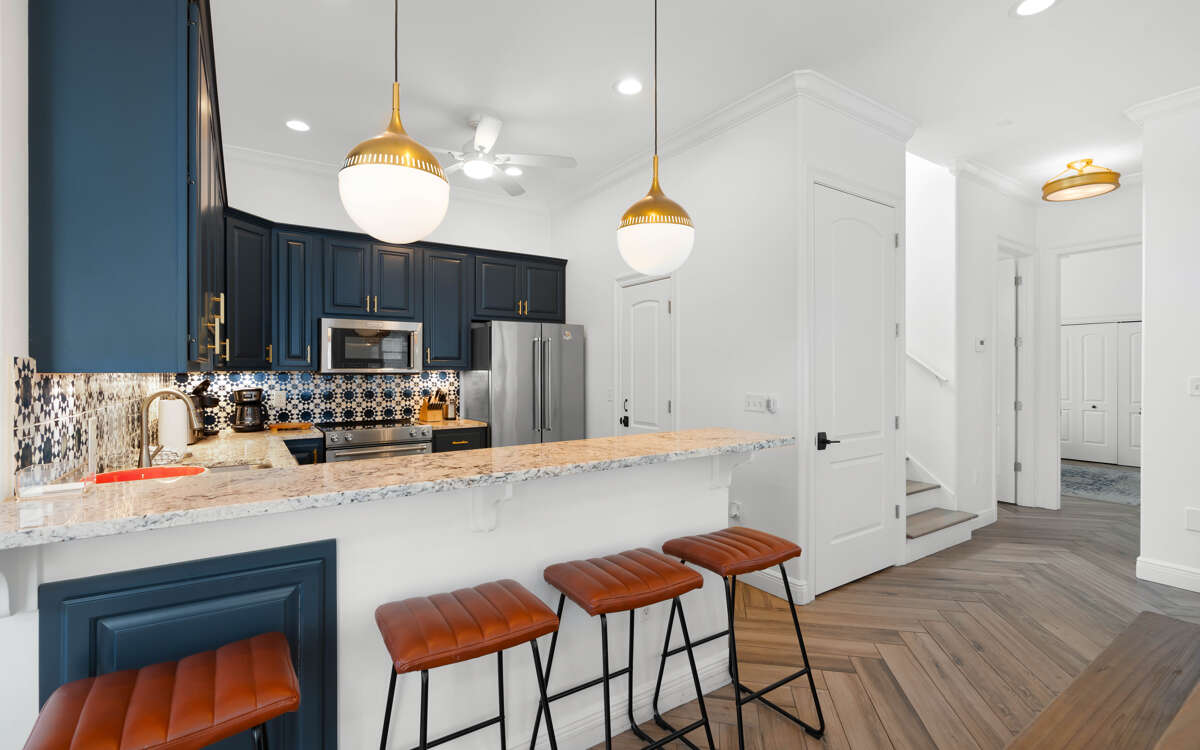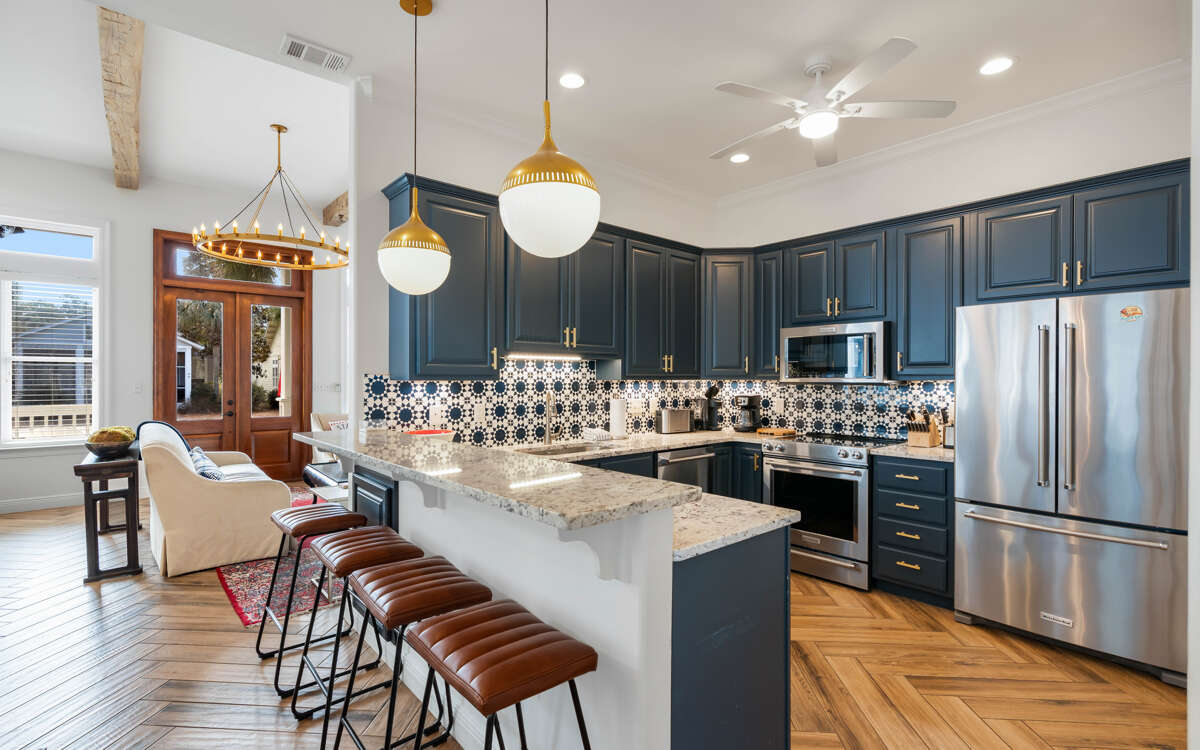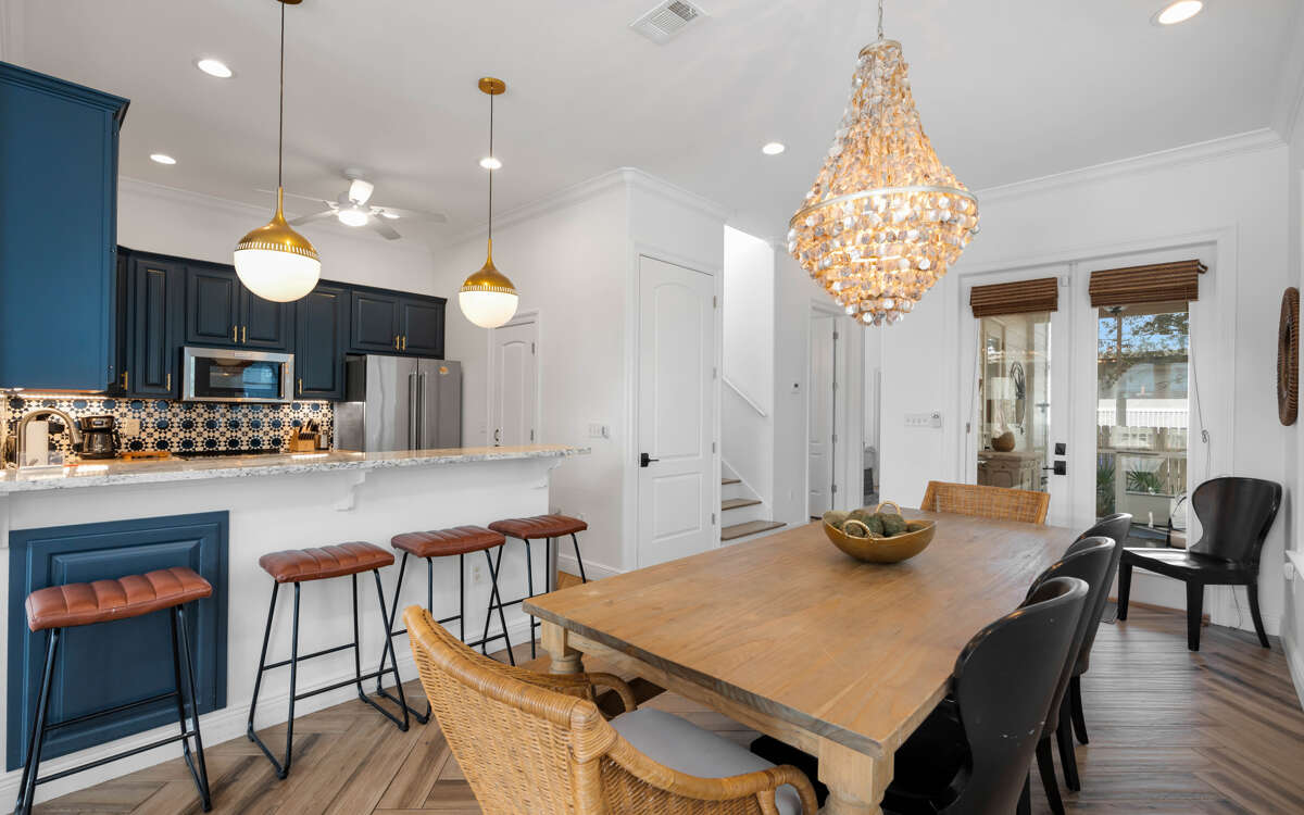Inside, the kitchen is built for real beach living: rich blue cabinetry, gleaming quartz, and a generous island that naturally becomes the gathering spot. The dining table is made for easy, linger-worthy meals.